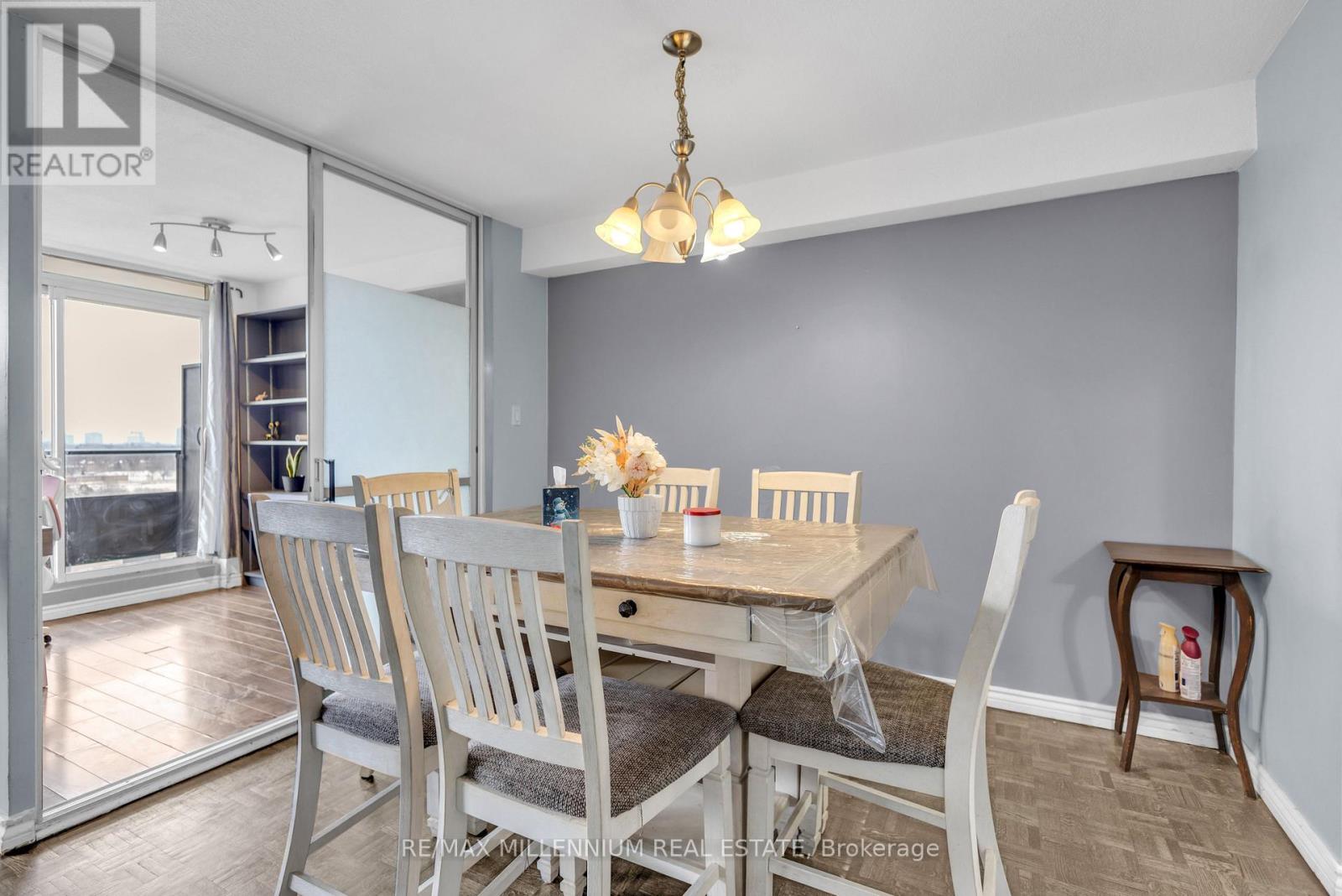 Absolutely stunning 2 Bedroom + Den suite offering a spacious 1,300+ sq. ft. layout with spectacular southeast Toronto skyline views. The thoughtfully designed floor plan features a designer kitchen with maple cabinetry, modern fixtures, ceramic flooring, and a stylish backsplash perfect for everyday living and entertaining. -Upgraded bathrooms showcase contemporary vanities, updated lighting, and modern finishes. Enjoy the convenience of ensuite laundry, a generous primary bedroom with walk-in closet and private ensuite, and a versatile den ideal as a third bedroom, home office, or study.Condo fees include parking, high-speed internet, water, hydro, and access to premium amenities including a gym, pool, sauna, party and meeting rooms, and children's playground offering worry-free living.Ideally located minutes from schools, parks, shopping, and transit, this move-in-ready home blends space, comfort, and city living perfectly. (42213100)