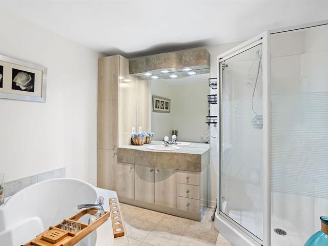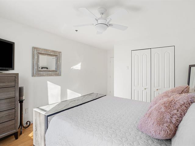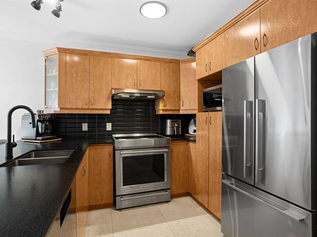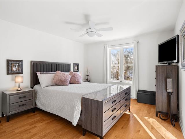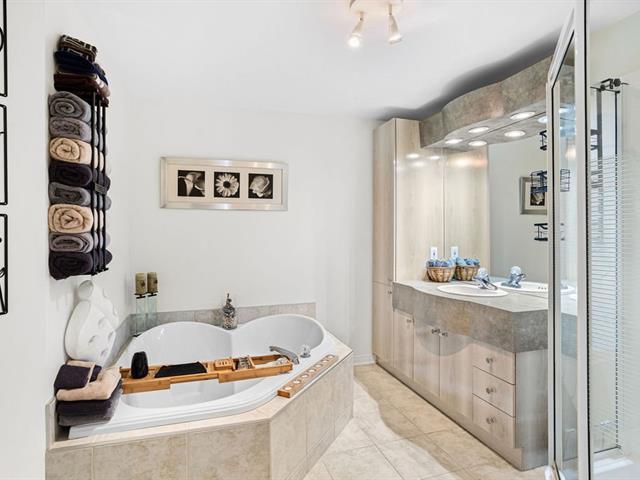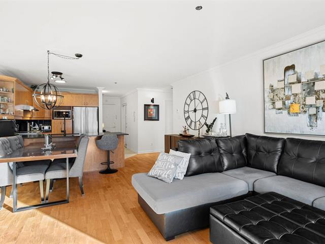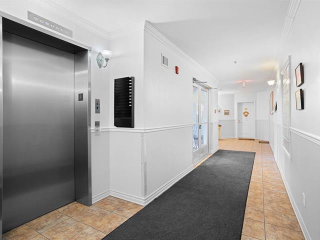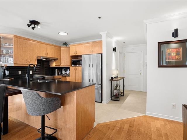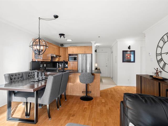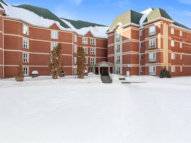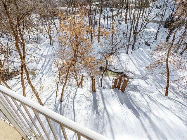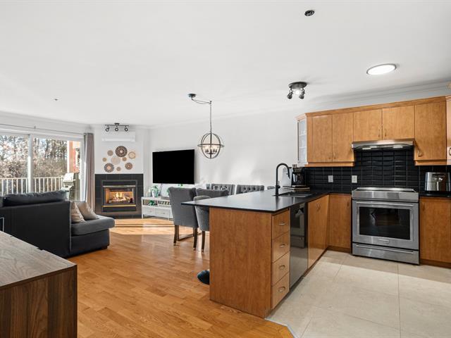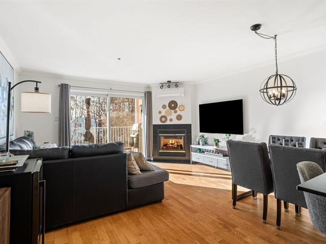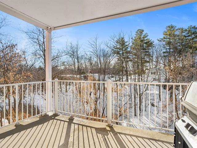River view. Nestled in a quiet, wooded setting, this beautiful open-concept condo with 2 spacious bedrooms, located on the 3rd floor with elevator, offers space, natural light, and serenity. Large living room with gas fireplace, hardwood floors, expansive granite countertops, and a large private balcony with gas hookup for your BBQ. Enjoy river views from the living room and both bedrooms, along with its gentle year-round sound. Peaceful condominium close to all services and 3 minutes from the hospital. Outdoor parking and garage access for unloading groceries and washing your vehicle. A true turnkey property. (56219168)