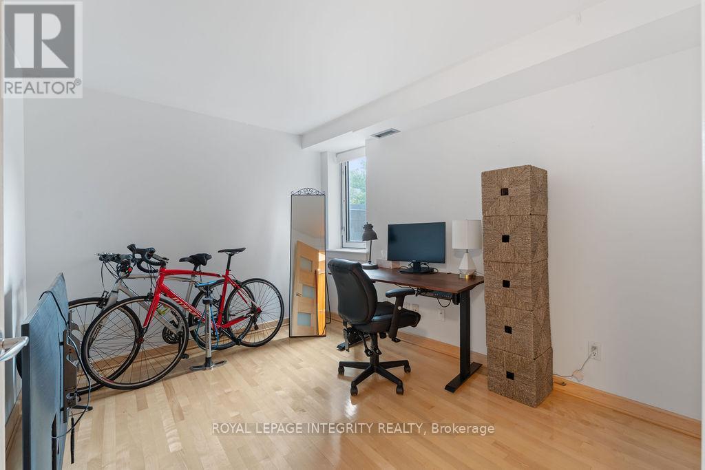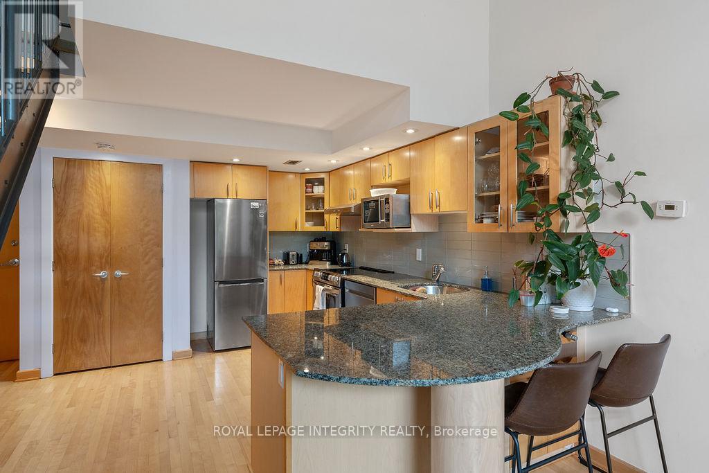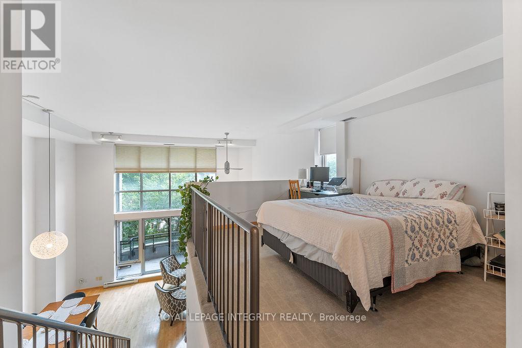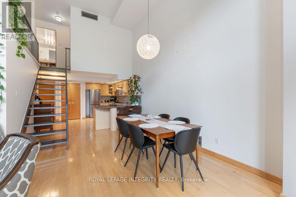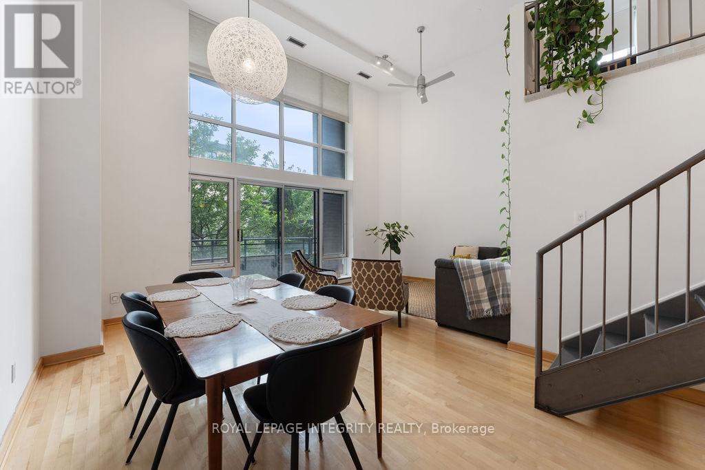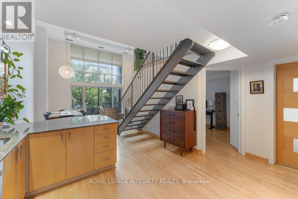 Over 1,000sf of modern loft-style living in Suite 111 @ 29 Main St, The Glassworks by Charlesfort, designed by award-winning architect Barry Hobin. This 2-bedroom, 2-bath suite features an open-concept layout with gleaming hardwood floors, a sleek kitchen with granite eat-up breakfast bar, and 17-foot floor-to-ceiling windows that open to a private curved east facing balcony (approx. 6' x 18') perfect for entertaining or relaxing. Upstairs offers a generous bedroom, full bath, walk-in closet, and ample storage. Residents enjoy a rooftop terrace with a BBQ and entertaining space, plus elevator access. Ideally located just a block from the Rideau Canal, walking distance to ByWard Market, Rideau Centre/LRT, Centretown dining, museums, and Lansdowne Parks concerts and sporting events. Quick access to Hwy 417 and nearby Canal and Rideau River trails make this urban oasis perfect for city living with a touch of nature. Don't miss this one! (42199337)