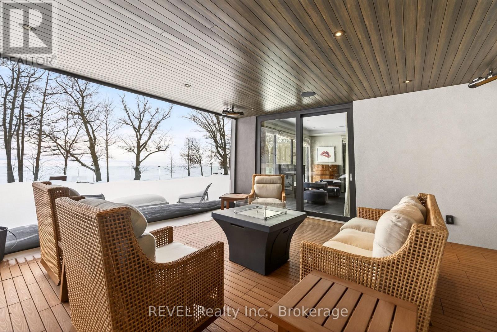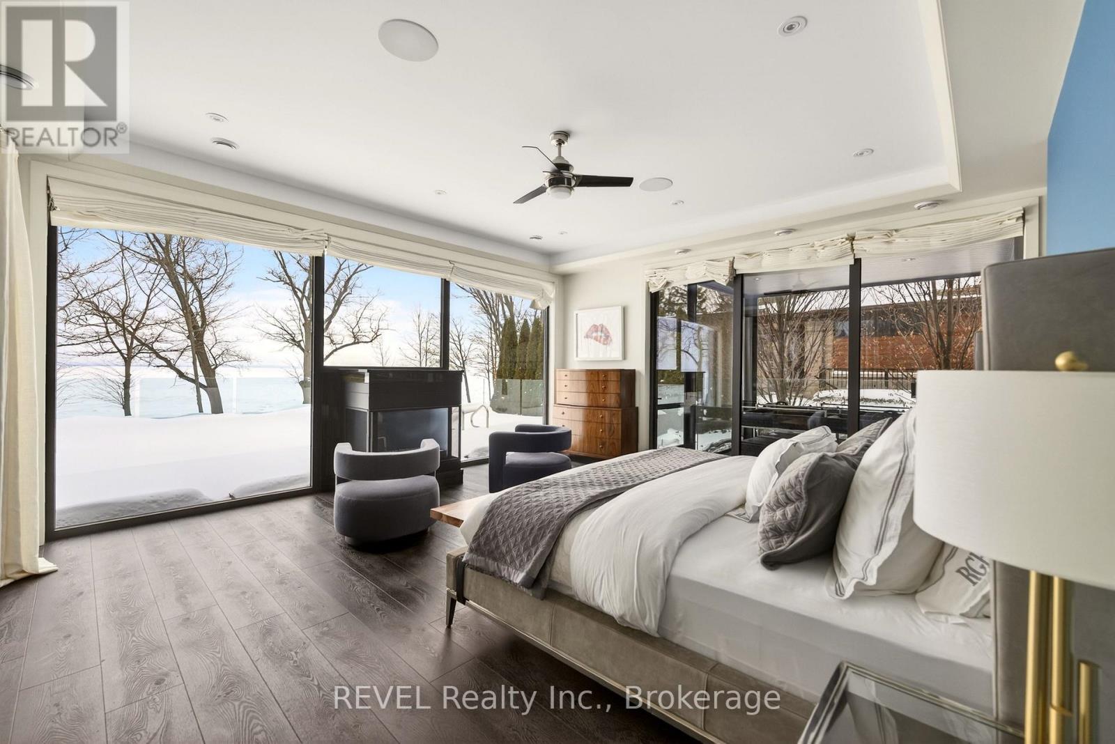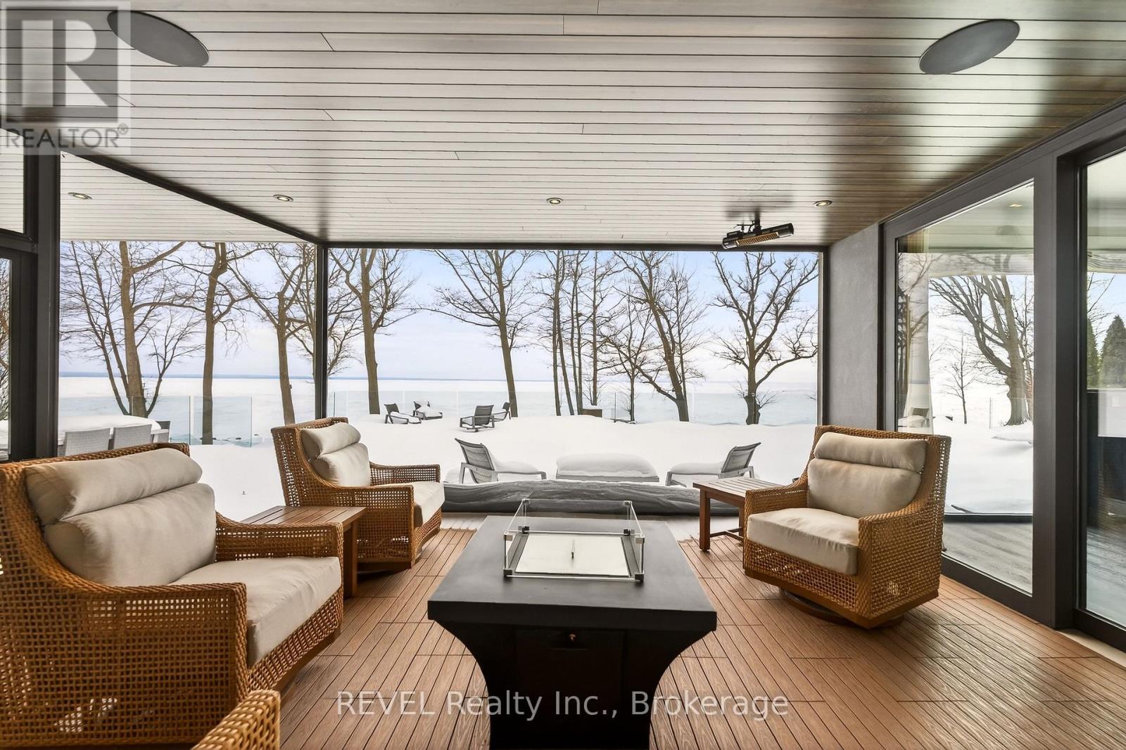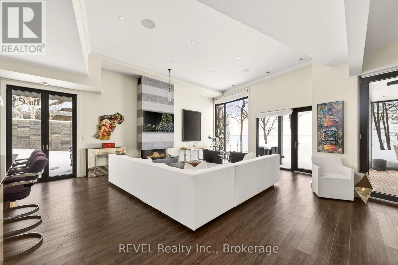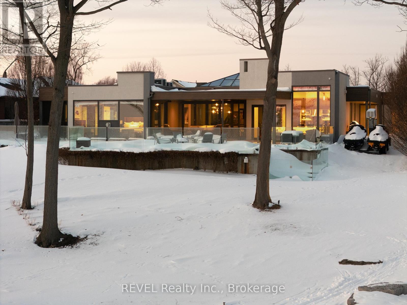 Unforgettable modern beachfront estate in the charming lakeside town of Ridgeway, offering 113ft of private Lake Erie shoreline and breathtaking panoramic water views. Designed as the ultimate family retreat or year-round luxury residence, this exceptional oversized bungalow blends refined architecture with effortless coastal living. The home features four expansive bedrooms, each with its own beautifully appointed ensuite and generous closet space. The primary suite is a true sanctuary, complete with a gas fireplace, multiple walk-out terraces, a spacious walk-in closet, and stunning lake views enjoyed from your bed, freestanding soaking tub, and glass shower. Thoughtfully designed for both everyday living and entertaining, the open-concept main living areas are complemented by a large butler's pantry, built-in bar, and seamless indoor-outdoor transitions, including a glass-enclosed atrium. Screened-in patios with gas heaters extend seasonal enjoyment. Custom details and designer finishes are showcased throughout, including Restoration Hardware lighting and premium imported German windows & doors. A main floor laundry room, mudroom entry, attached four-car garage, and separate detached two-car garage provide exceptional convenience and storage for vehicles, boats, and recreational equipment. Set on a substantial estate lot, the home is positioned well back from the road for privacy while maintaining ideal proximity to the lake. The grounds offer expansive green space alongside a private beach framed by an armour stone shoreline and professional landscaping. Outdoor living is unparalleled, featuring oversized aggregate patios with multiple lounging and dining zones, fireside gathering areas, a large saltwater inground pool with a hidden electric cover, and sleek glass railings that preserve unobstructed lake views. Waterfront ideal for kayaking, paddleboarding, and boating - and a nearby launch just steps away - this is luxury waterfront living at its finest. (42216359)
