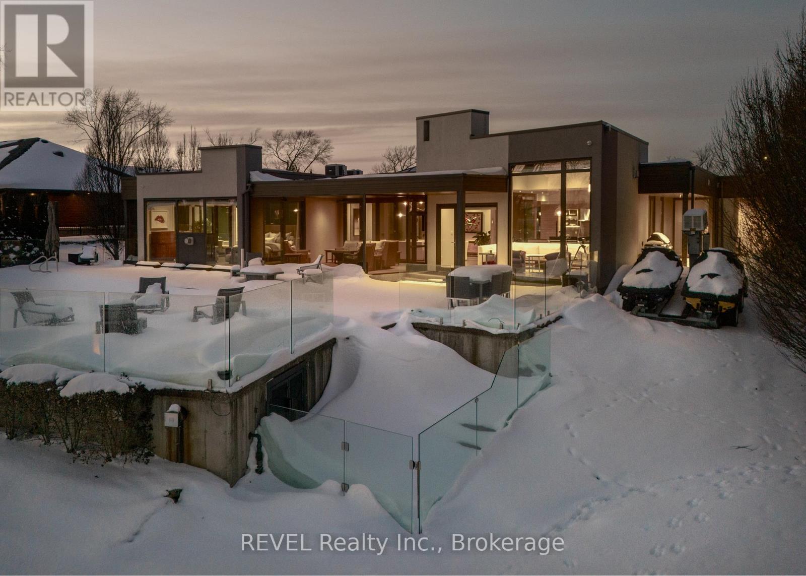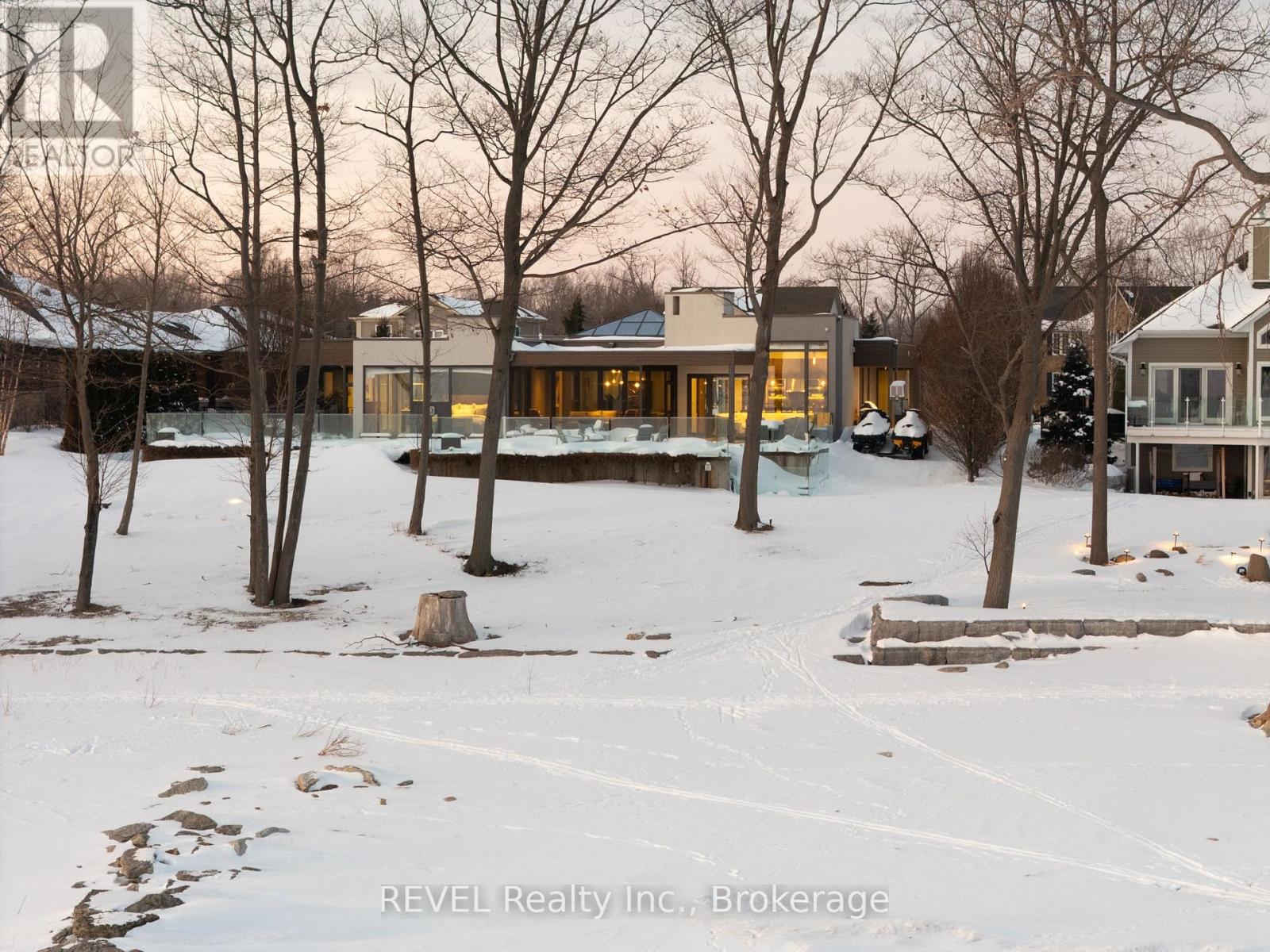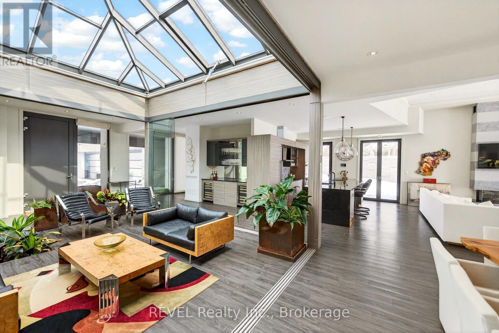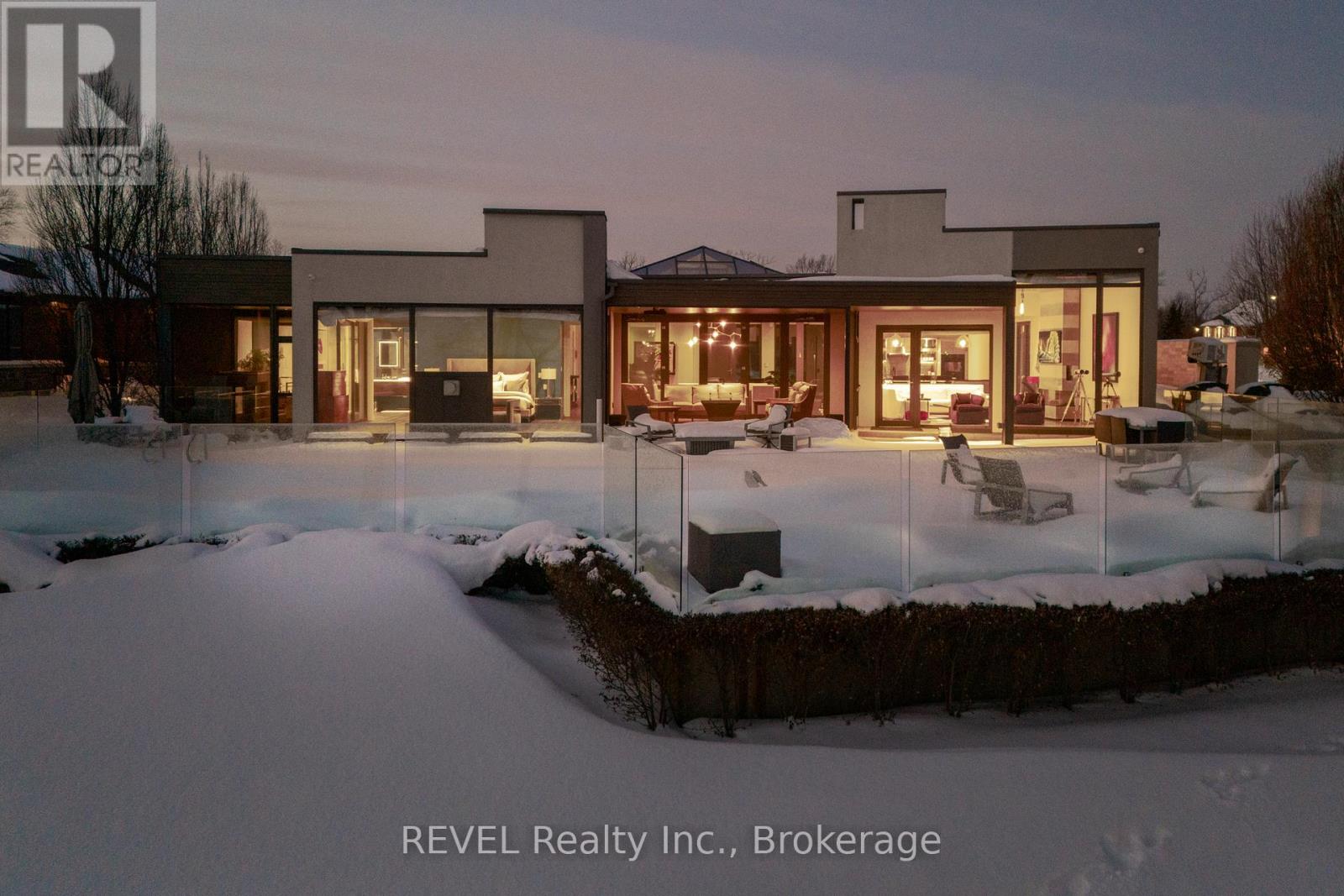 Unforgettable modern beachfront estate in the charming lakeside town of Ridgeway, offering 113ft of private Lake Erie shoreline and breathtaking panoramic water views. Designed as the ultimate family retreat or year-round luxury residence, this exceptional oversized bungalow blends refined architecture with effortless coastal living. The home features four expansive bedrooms, each with its own beautifully appointed ensuite and generous closet space. The primary suite is a true sanctuary, complete with a gas fireplace, multiple walk-out terraces, a spacious walk-in closet, and stunning lake views enjoyed from your bed, freestanding soaking tub, and glass shower. Thoughtfully designed for both everyday living and entertaining, the open-concept main living areas are complemented by a large butler's pantry, built-in bar, and seamless indoor-outdoor transitions, including a glass-enclosed atrium. Screened-in patios with gas heaters extend seasonal enjoyment. Custom details and designer finishes are showcased throughout, including Restoration Hardware lighting and premium imported German windows & doors. A main floor laundry room, mudroom entry, attached four-car garage, and separate detached two-car garage provide exceptional convenience and storage for vehicles, boats, and recreational equipment. Set on a substantial estate lot, the home is positioned well back from the road for privacy while maintaining ideal proximity to the lake. The grounds offer expansive green space alongside a private beach framed by an armour stone shoreline and professional landscaping. Outdoor living is unparalleled, featuring oversized aggregate patios with multiple lounging and dining zones, fireside gathering areas, a large saltwater inground pool with a hidden electric cover, and sleek glass railings that preserve unobstructed lake views. Waterfront ideal for kayaking, paddleboarding, and boating - and a nearby launch just steps away - this is luxury waterfront living at its finest. (42216359)