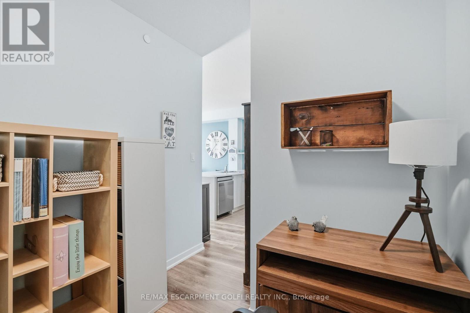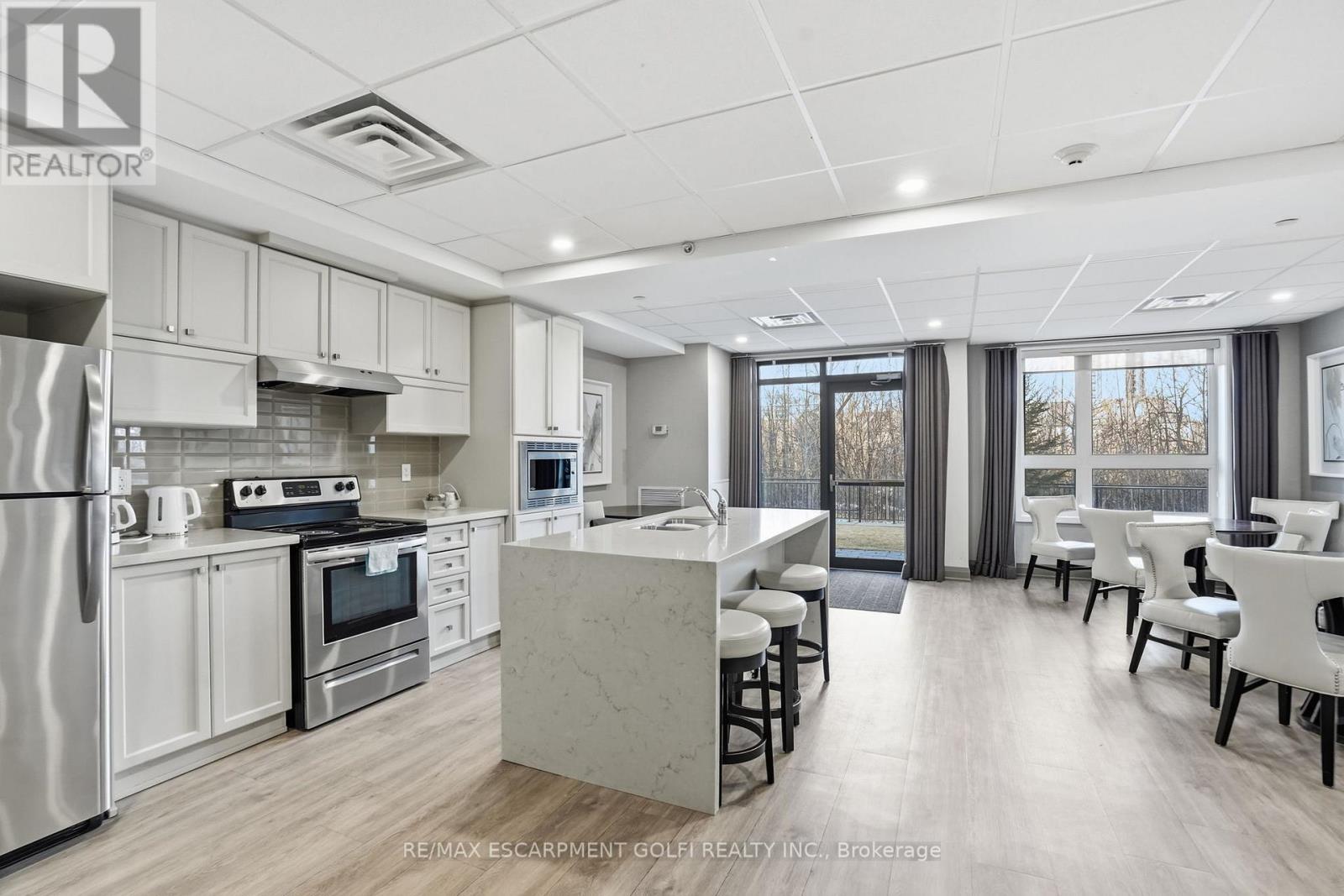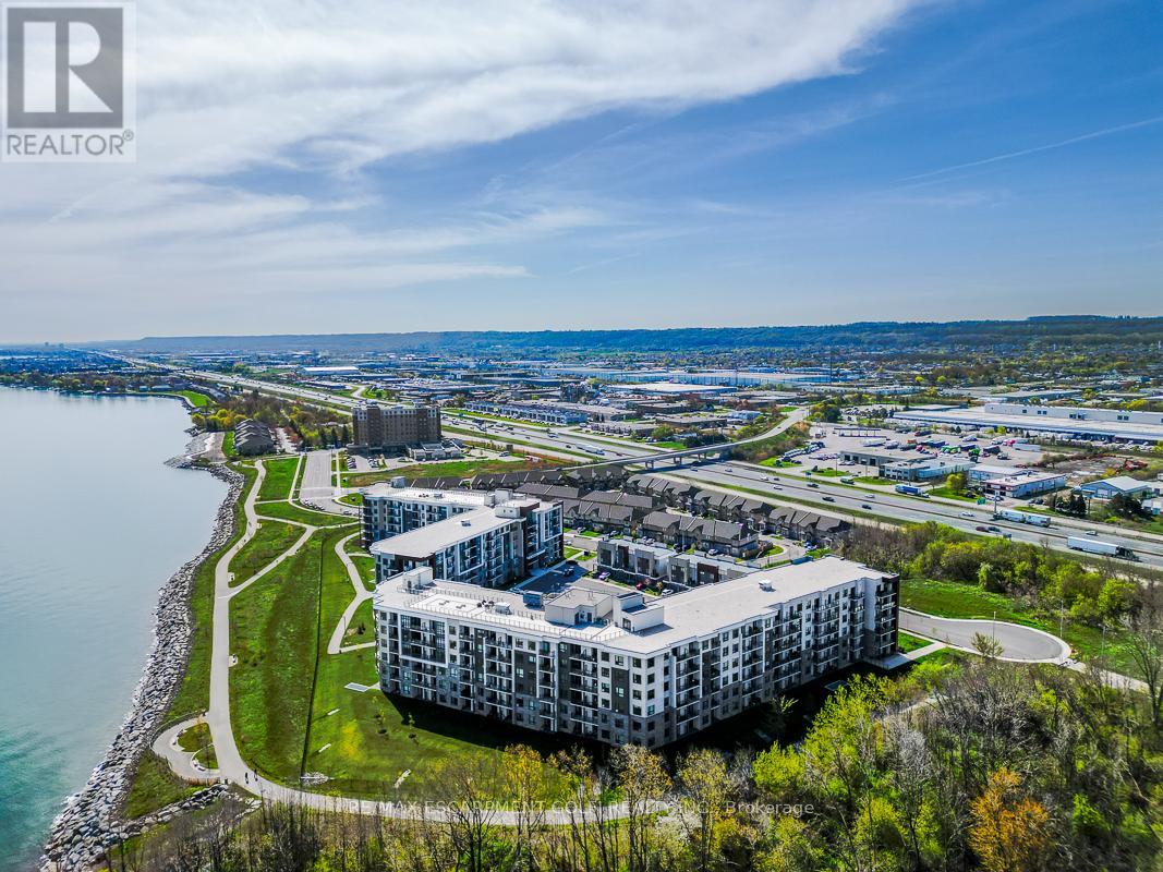 Welcome to Sapphire Condos and effortless lakeside living on the shores of Lake Ontario. This carpet-free 1 bedroom + den suite offers convenient main-level living; no elevators when unloading groceries or welcoming guests. The open-concept kitchen features stainless steel appliances and breakfast bar seating, flowing into a bright living area with sliding doors to your private patio. The spacious primary bedroom includes a walk-in closet, and the den is ideal for a home office or guest space. Complete with a 4-piece bath and in-suite laundry. Enjoy rooftop terrace views of the lake, fitness centre, party room, underground parking, locker, and ample visitor parking. Steps to trails, beach, and quick QEW access. Low-maintenance waterfront living at its best. (42218739)