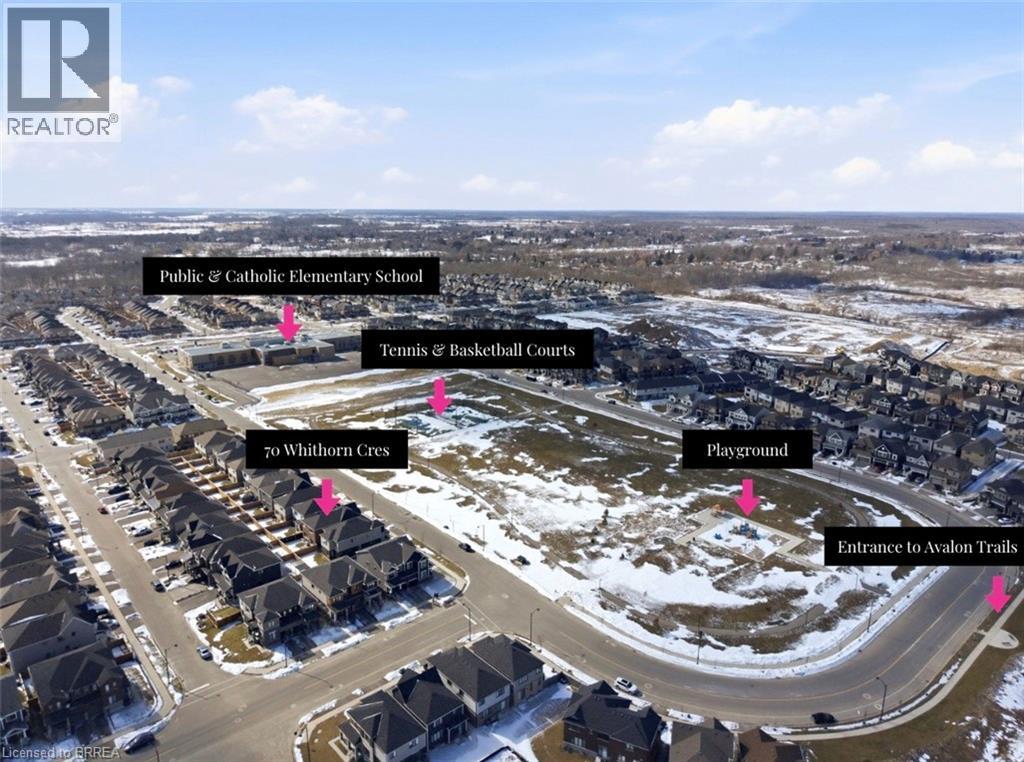 Welcome to 70 Whithorn Cres, where location and design truly stand out. Full-brick, park-front 4-bedroom home with over 2,300 sq ft above grade on a quiet street. Directly across from a large park with playground, courts, and walking trails. Walk to school in 3 minutes; Tim Hortons, daycare, and a family doctor in 5 minutes. Only a 5 minute drive to downtown Caledonia and Grand River, 12 minutes to Hamilton Airport, 15 minutes to Hamilton, and 40 minutes to Port Dover Beach. Grand 20-ft foyer, upgraded kitchen with quartz counters, and bright living area with hardwood flooring. Spacious primary suite with spa-style ensuite and soaker tub. Three additional bedrooms offer great flexibility. Unfinished but fully insulated basement ready for future development. Built in 2022 and under Tarion Warranty. Smart home features include a Nest thermostat, a Ring camera, Samsung Frame TV and Samsung Hub Fridge (connected to TV and Ring). 91-ft lot with a fully fenced backyard and a private double driveway accommodating a variety of vehicles. Most furniture is negotiable for the buyer’s convenience, if desired. Homes with this level of quality, walkability, and park-front location are rarely available (70205836)