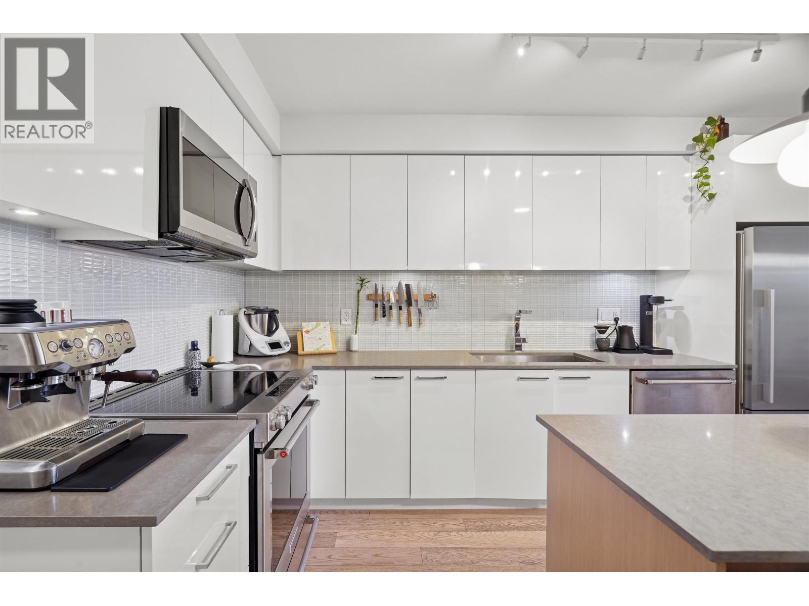 Welcome to Vya by PortLiving in vibrant Mt Pleasant! This 955 SF, 2 bed, 2 bath home, built in 2017, sits on the quiet side of the building and offers a smart, functional layout with 1 den, dedicated office, and insuite storage/pantry. The gourmet kitchen features quartz countertops, glass tile backsplash, ample cabinetry, and full-size Fisher & Paykel and KitchenAid stainless steel appliances. The primary bedroom includes a walk-through closet with custom built-ins and a spa-inspired ensuite. Hardwood floors throughout plus smart lighting, thermostats, and blinds add modern comfort. Enjoy the 235 SF elevated patio with space for lounge seating, BBQ, and dining set, all with North Shore mountain views. Very well-maintained, pet-friendly building with 2 landscaped terraces, fire pit, and BBQ area. Steps to shops, cafes, and future Main-Broadway Station. School catchment: Florence Nightingale Elem, Sir Charles Tupper Sec, French Immersion Van Tech Sec. Includes: 1 parking + 2 lockers. OH Feb 28 + March 1, 2-4 PM (32492908)