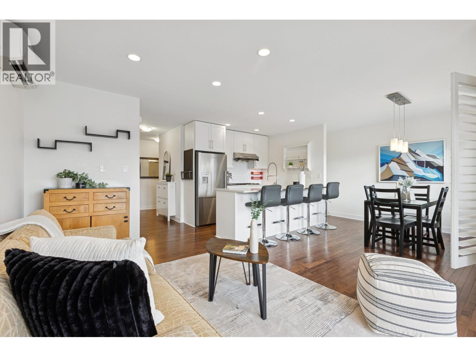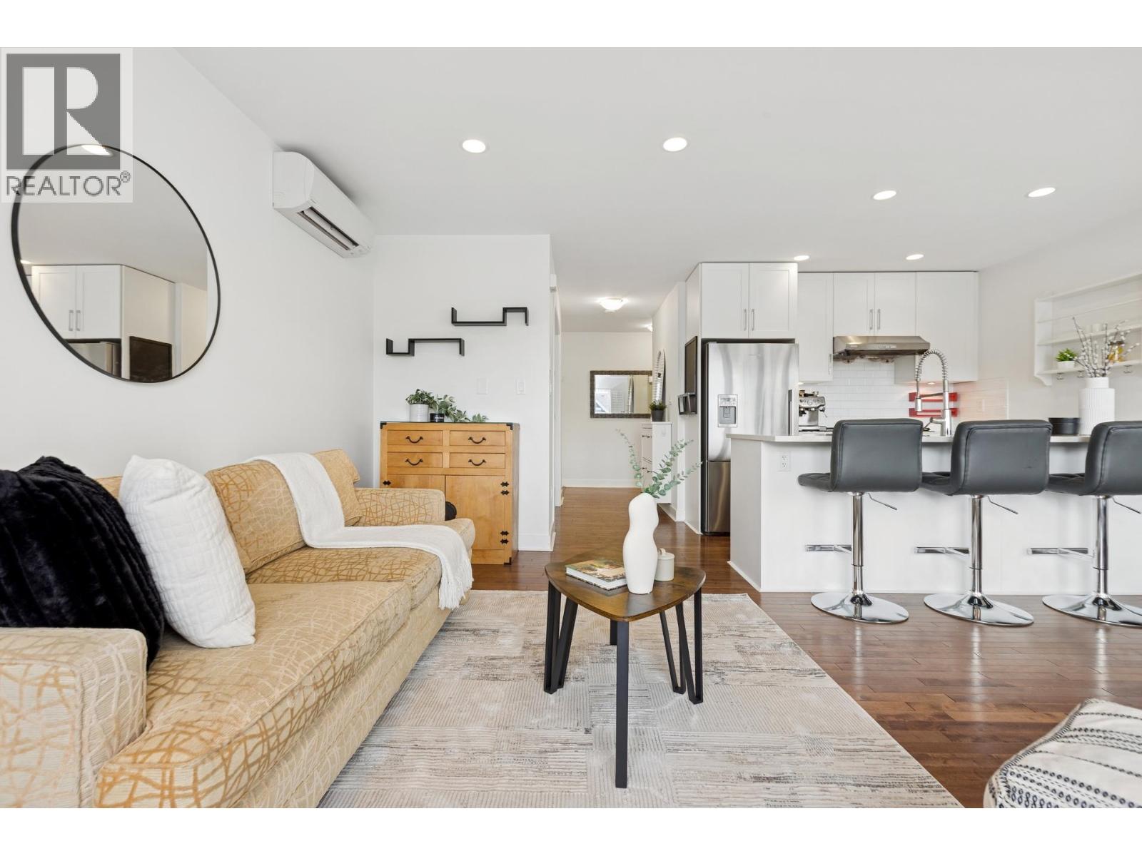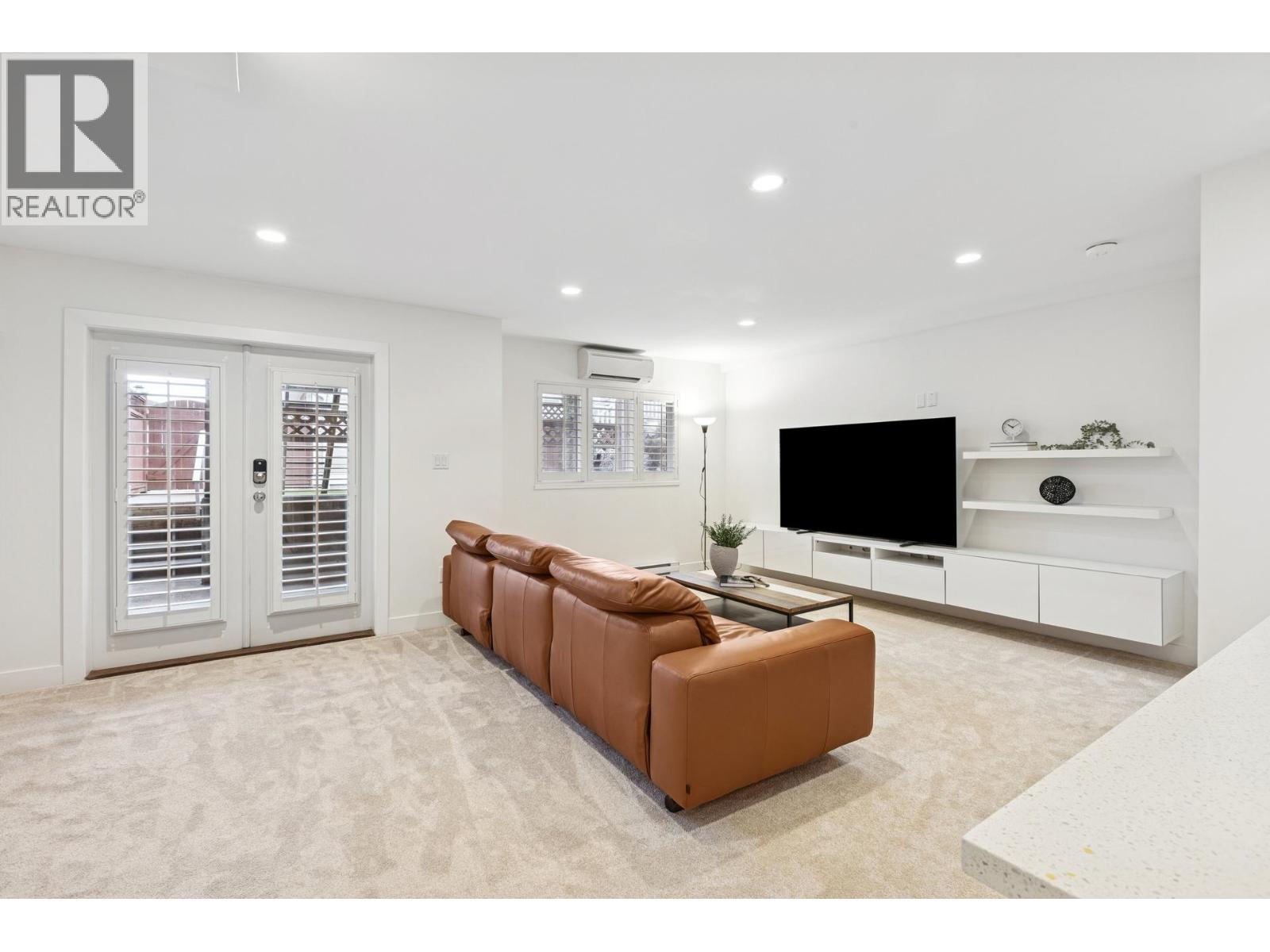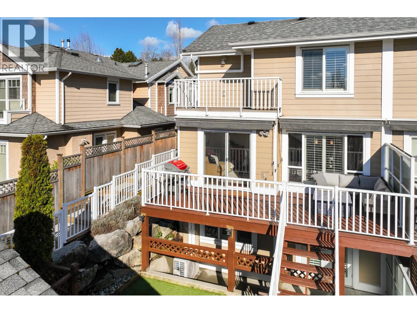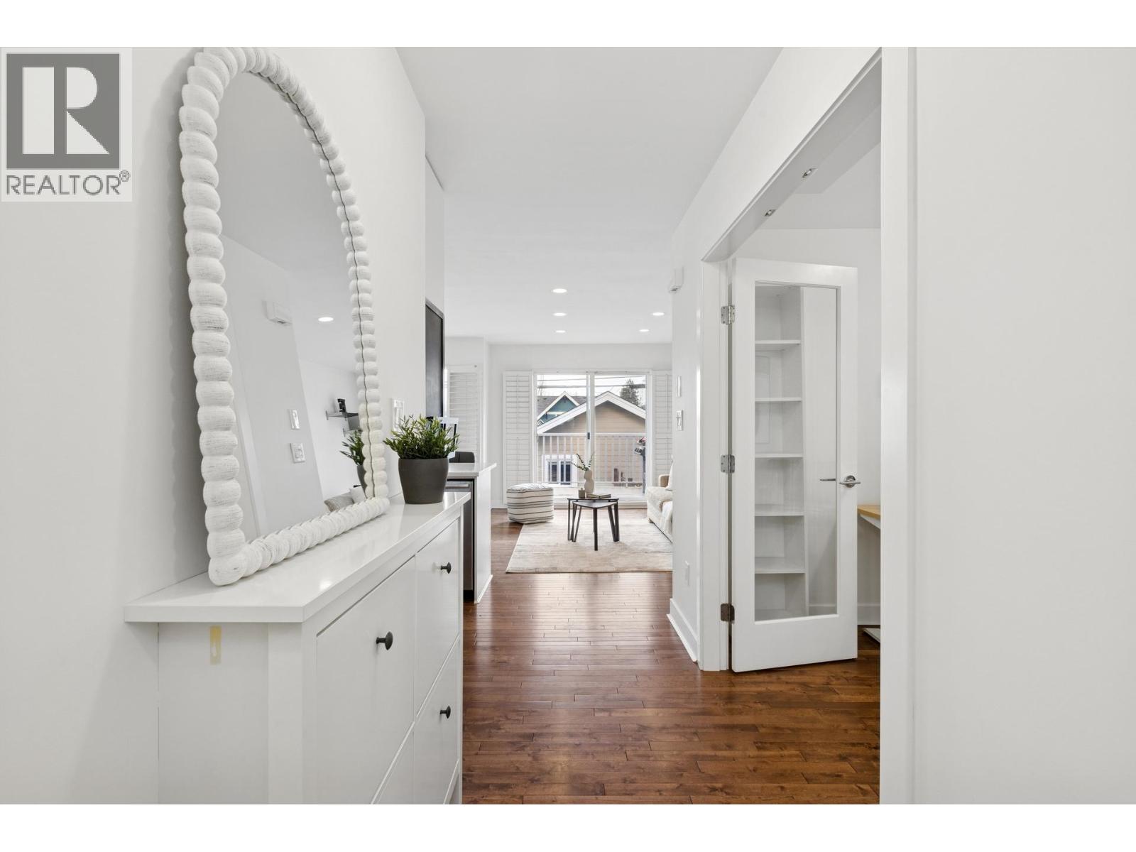 South-facing fourplex offering nearly 2,000 sq/ft of turn-key living in Central Lonsdale. This 3-bed + den home offers a detached-scale layout across 3 levels. The main floor features a designer kitchen with shaker cabinetry, quartz counters, gas cooktop, and bar seating. Open living and dining areas lead to an expansive south-facing deck and private fenced yard with low-maintenance artificial turf. Unique to this floor plan is a main-floor office with French doors and a full bathroom. Upstairs features a spacious primary suite with a walk-in closet and private SW balcony, plus a 2nd bedroom and spa-style bath with double vanity. The lower level offers a separate entrance, bedroom, and bath - perfect as a nanny suite or future rental (kitchenette ready). Recent upgrades include a high-efficiency heat pump (A/C on all floors), fresh paint, and new carpets. 2 parking (1 garage). Just off the Green Necklace trail, steps to Lonsdale shops and the new Harry Jerome Rec Centre. Quick Hwy 1 access. (32493616)