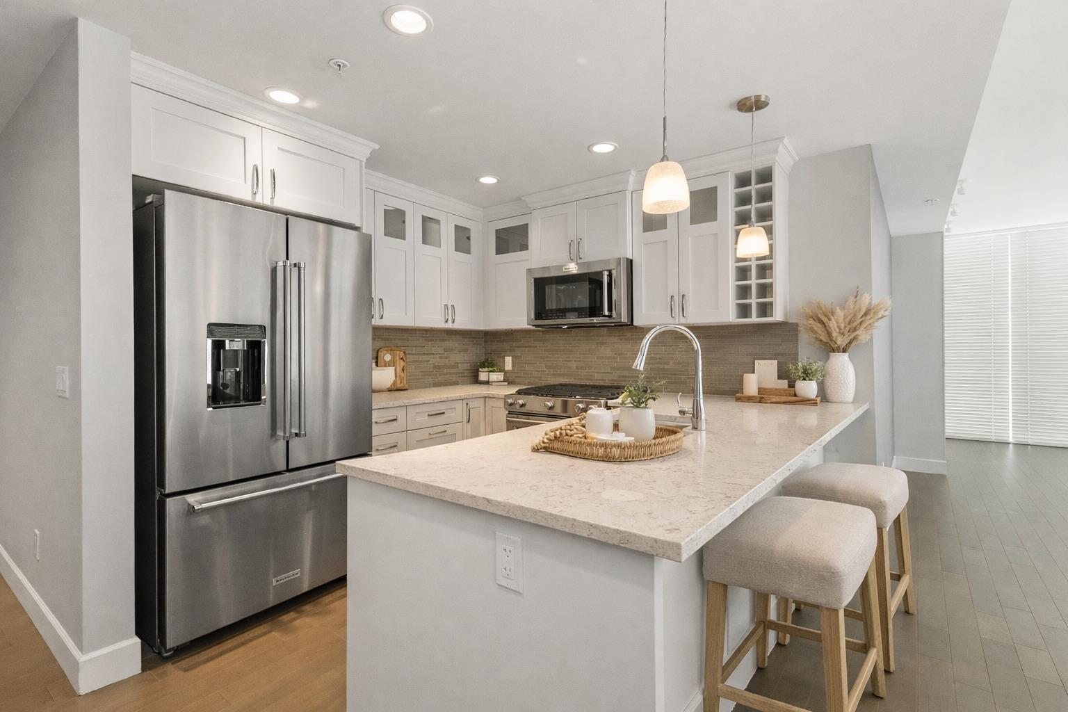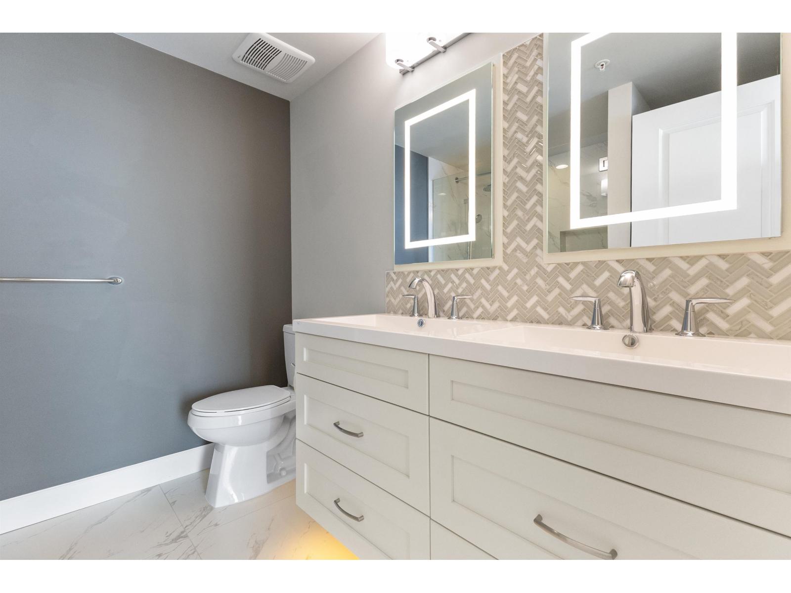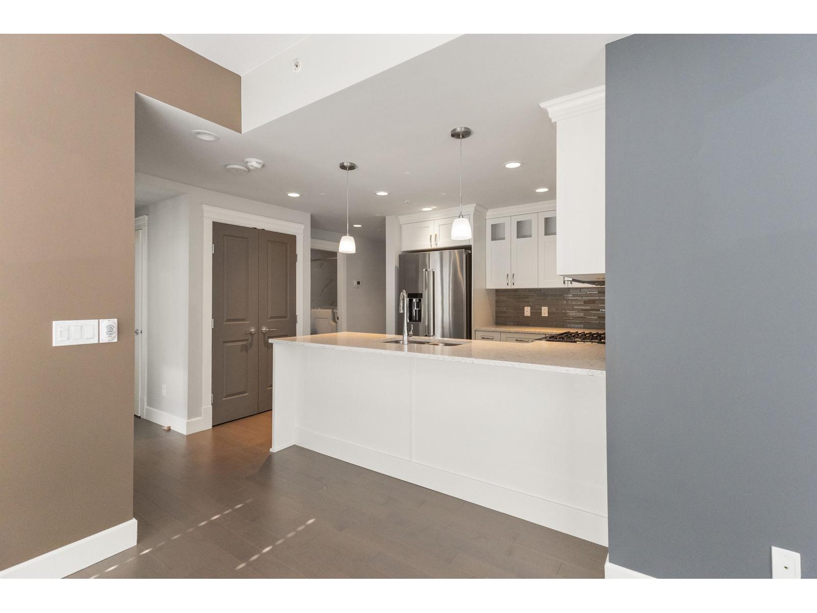 Amazing corner condo on the 22nd floor with wall-to-wall, floor-to-ceiling windows. Fantastic views of Mt. Baker & Valley. This 2 bdrm, 2 bath condo was upgraded & should be in a magazine. Modern kitchen w/high-end S/S appliances, quartz counter tops, bright dining area& a living room with a gas fireplace. Covered sundeck to adore the gorgeous view & sunsets. 2nd bedroom/office has a wall of cabinets, murphy bed. Deluxe primary suite w/walk through closets & ensuite, 2 sinks, tiled walk-in shower. Full-size laundry rm. Lots of extras here. Geo cooling & heating. Parking for 1 plus a storage locker. Amenities galore- indoor pool, hot tub, fitness centre, club room, workshop, 2 guest suites, restaurant & doctor's office in building& pet-friendly. Walk to Mill Lake, shopping, and the hospital (32494183)