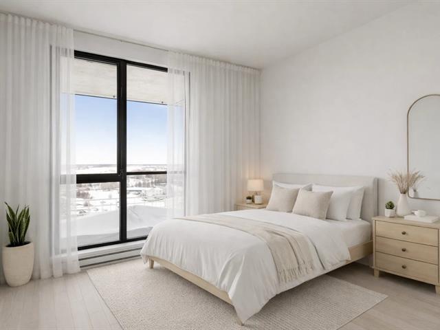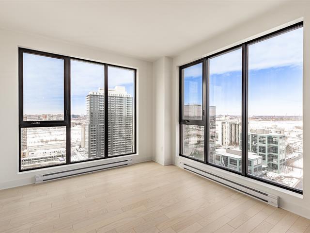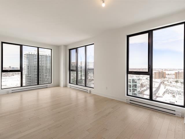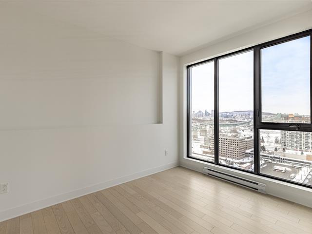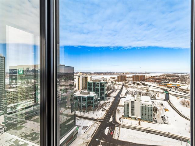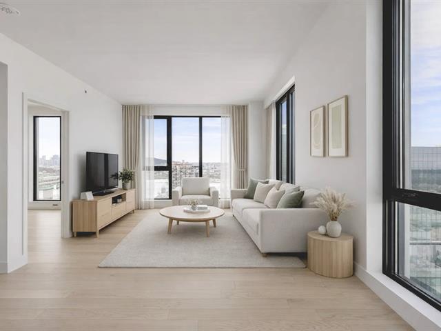 Corner unit on the 24th floor at Sir Charles Condominiums. Offering 2 bedrooms and 2 bathrooms, this residence stands out for its exceptional natural light and breathtaking views of the St. Lawrence River, the Jacques-Cartier Bridge and downtown Montréal-perfectly oriented for sunset views. The open-concept living areas strike the ideal balance of elegance, comfort and functionality. Prime location in the heart of Longueuil's new downtown, close to the metro, services and major highways. Option to purchase directly from the developer an indoor parking space ($51,000 + taxes) and a storage locker ($3,000 + taxes), subject to availability. GST/QST must be added to the asking price (54123734)