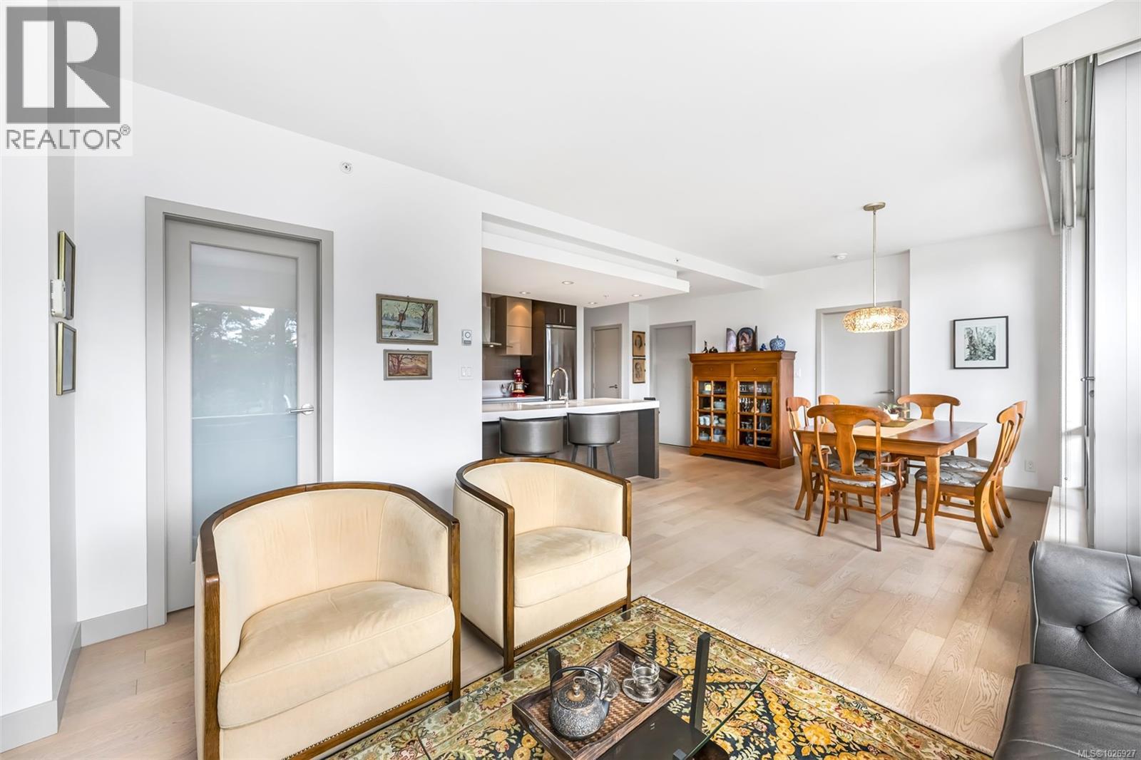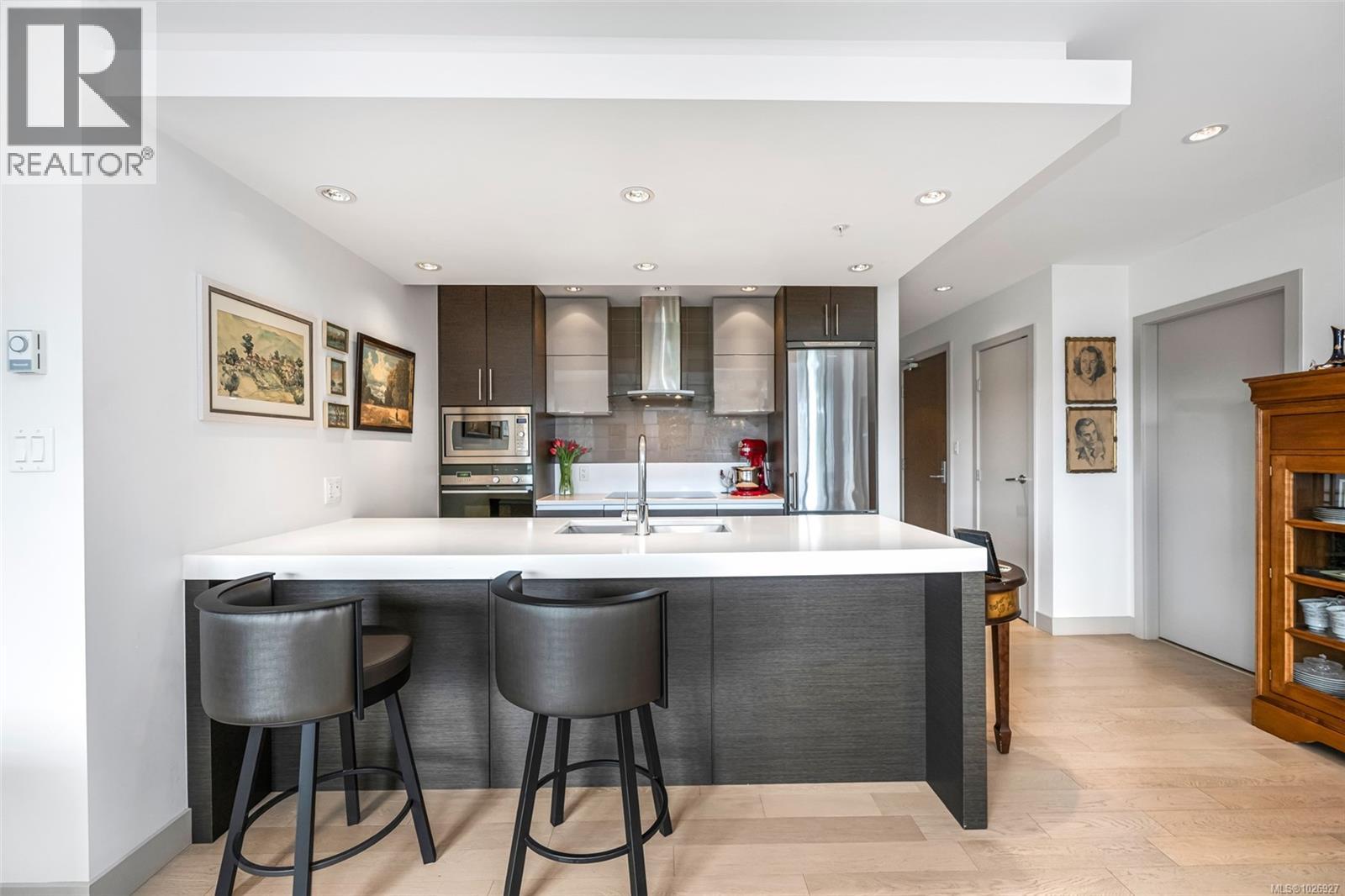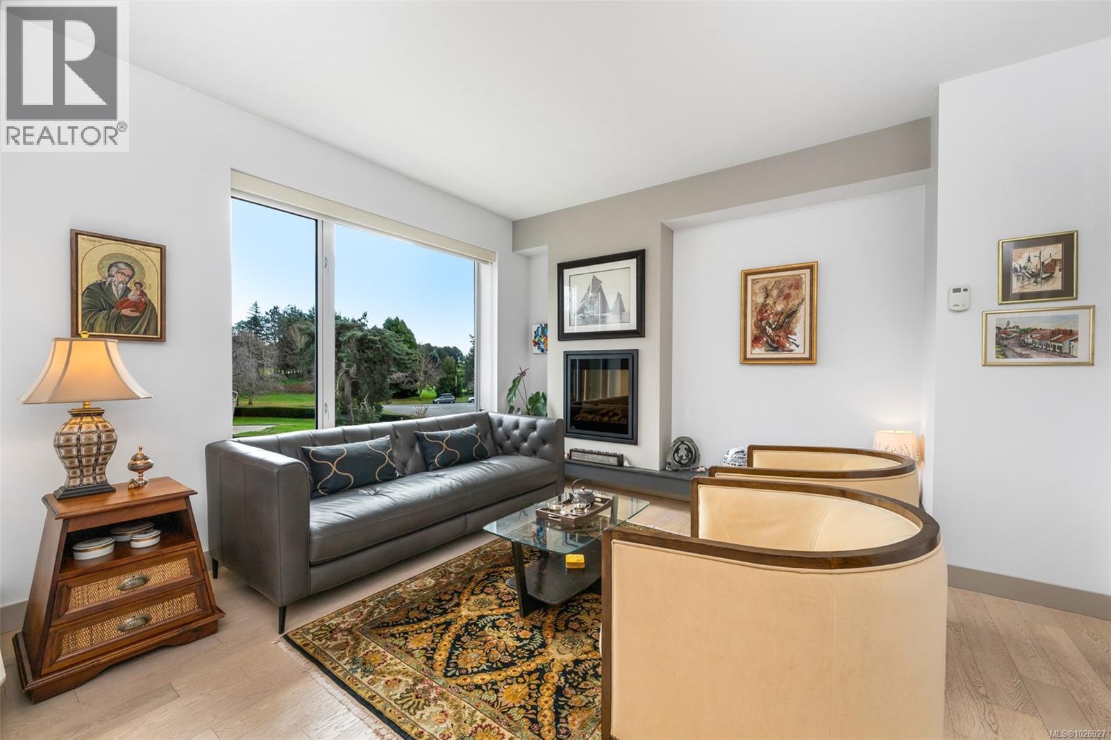 Experience luxurious urban living in this bright, beautifully appointed 4th-floor unit at “Douglas on the Park,” a premier steel-and-concrete building with stunning unobstructed Beacon Hill Park views and steps from the Dallas Rd waterfront. This 860+ sqft residence offers 1 bedroom + spacious den (ideal office or 2nd bedroom) and 1 elegant bath. Features include 9' ceilings, floor-to-ceiling windows, hardwood floors, and a modern fireplace. The chef-inspired kitchen boasts quartz countertops and premium stainless-steel appliances. The generous primary bedroom provides ample closet space, while the spa-like bath offers dual vanities, a soaker tub, glass shower, and heated floors. Includes secure underground parking, large storage locker, bike storage, EV charging, and pet-friendly living. Prime James Bay location near Cook St Village and downtown—walkable city living surrounded by nature, oceanfront paths, and vibrant community amenities. (30427626)