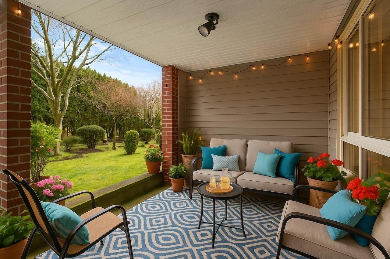 Private GROUND-floor living with green space views on QUIET side of building in sought-after Muirfield Gardens - not facing 152nd! Move-in ready 2 bed+large den(or 3rd bdrm!) with a functional layout, no wasted space, & luxury vinyl plank flooring throughout. Open kitchen boasts ample cabinet space, stone counters, breakfast bar & updated appliances. Spacious living/dining area with cozy gas fireplace(gas incl. in MF) opens to a fully covered patio-perfect for pets or entertaining! Bedrooms sit on opposite sides for privacy; primary has walk-in closet & ensuite. Large den is perfect for a home office or 3rd bdrm. Includes 1 parking (option to rent 2nd) & locker. Proactive strata with new depreciation report, roof (2024), & great amenities incl. guest suite & gym. Quick possession possible! (32494575)
