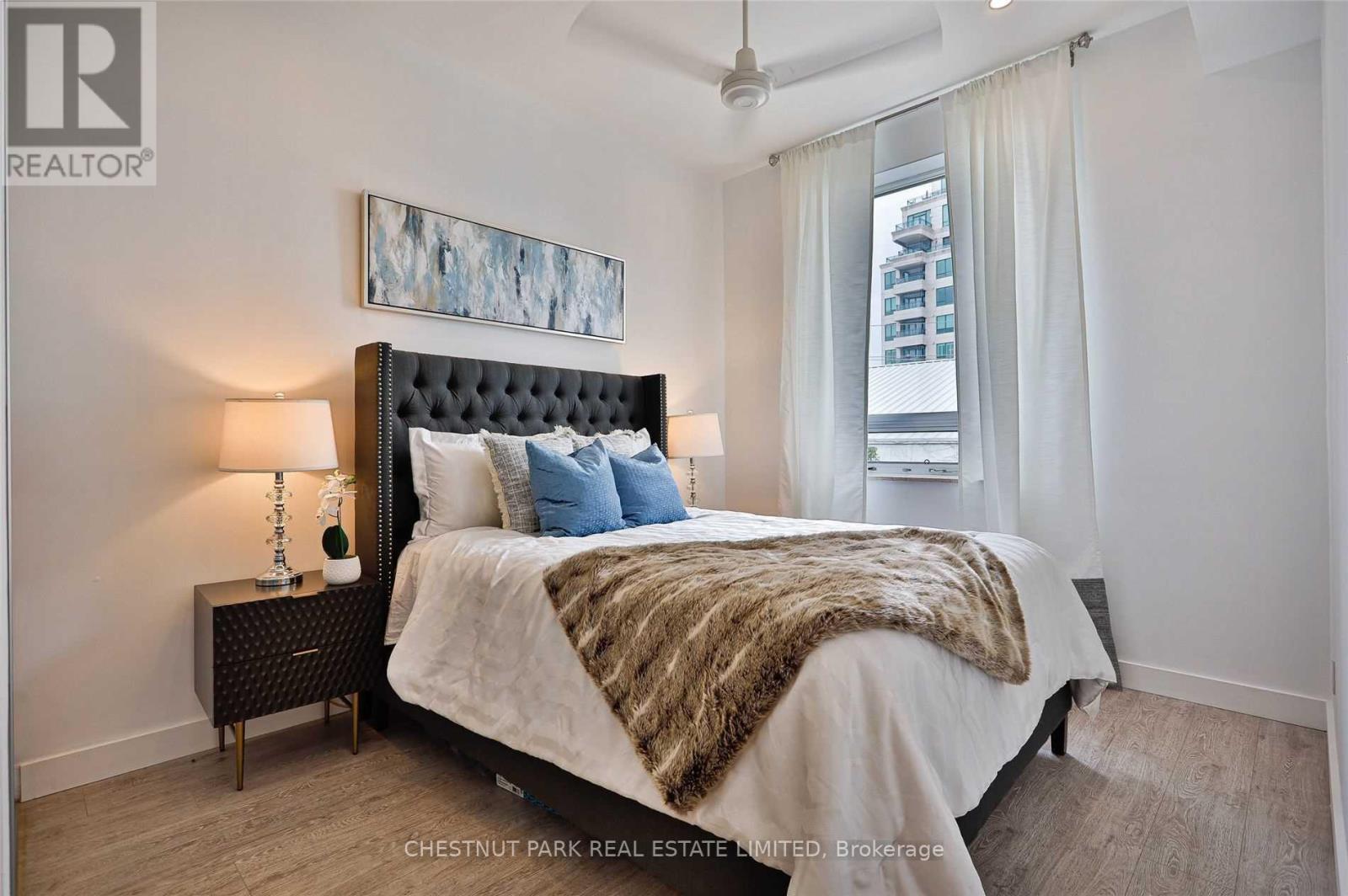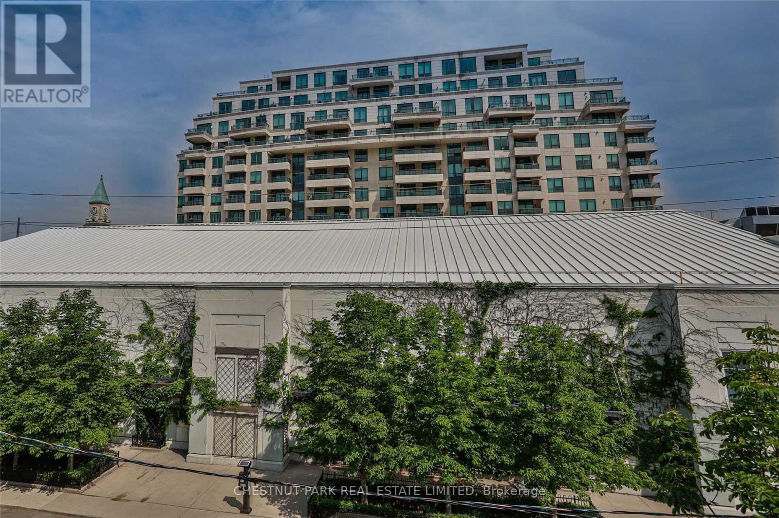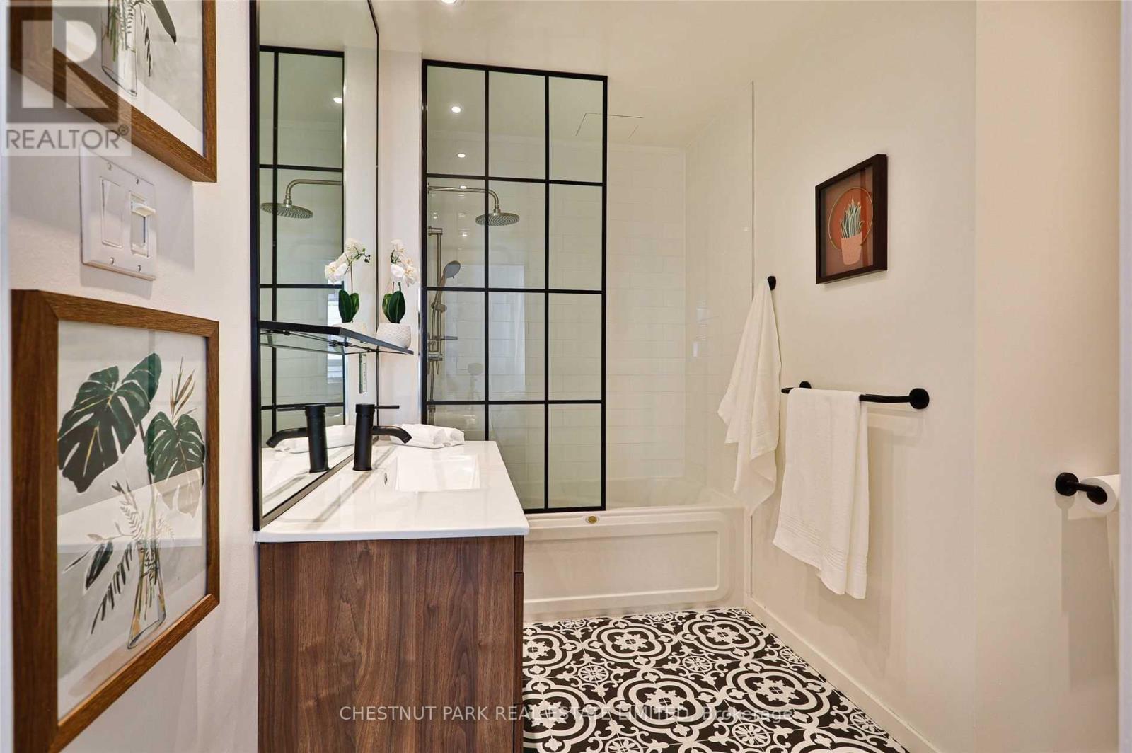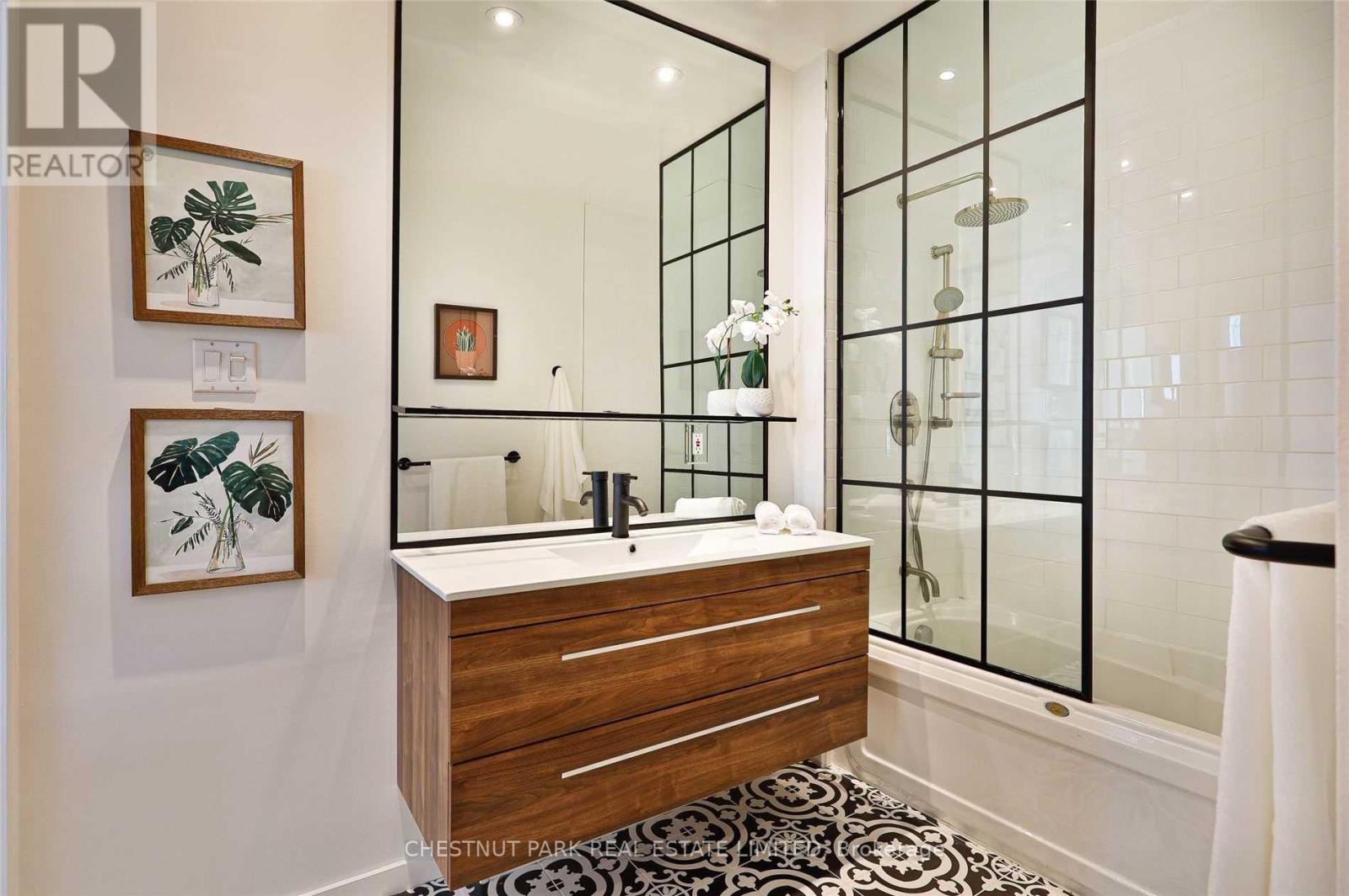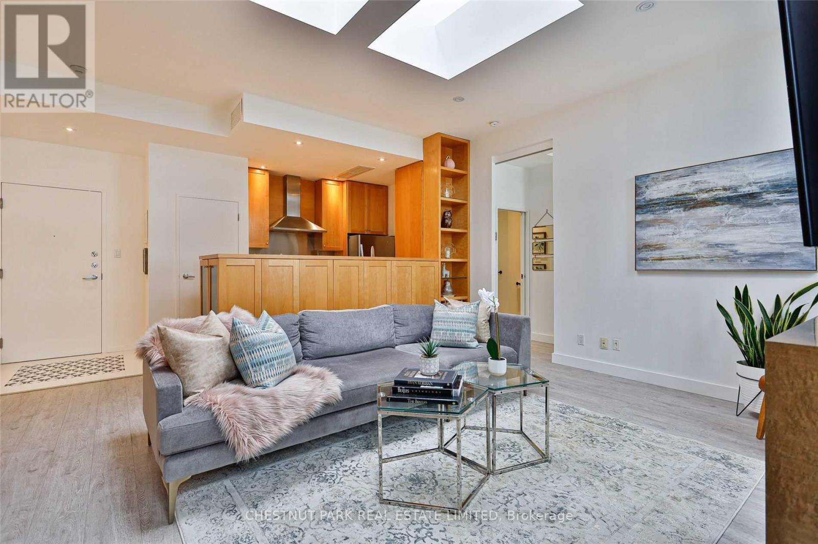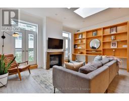 Two-bedroom layout plus large den. Bright, renovated open-concept living space featuring 10' ceilings with a gas fireplace, large skylights, a wall of built-in natural maple shelving/workspace, and two Juliette balconies with tree-lined views. Frigidaire stove, updated kitchen tile, and a chic renovated bathroom with custom glass panels, mirror, and a cantilevered sink. Top schools nearby. (42223481)