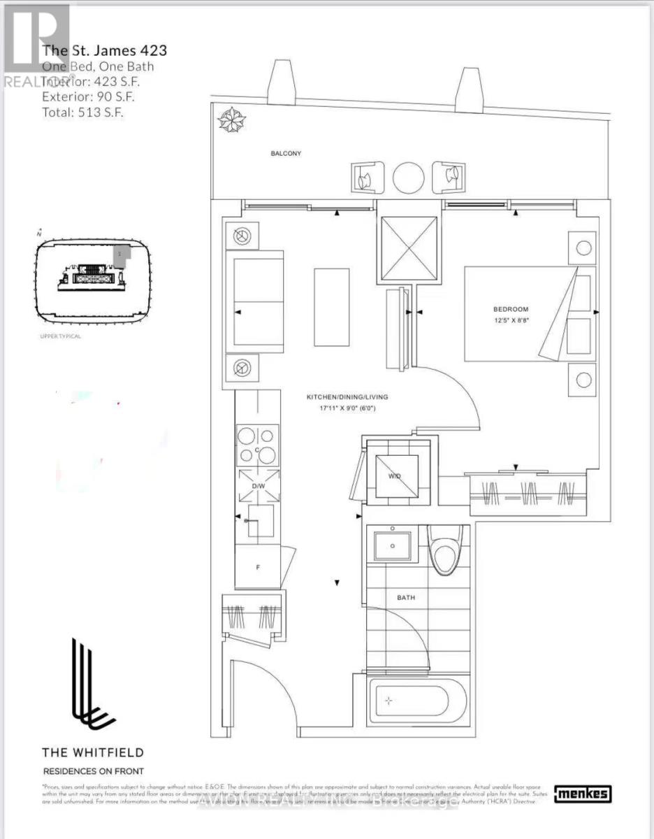 Brand new, bright high-floor 1-bedroom at The Whitfield with unobstructed city views and a spacious balcony. Featuring a fully enclosed bedroom with door for true privacy, open-concept living, a modern kitchen with integrated appliances and quartz countertops, ensuite laundry, and abundant natural light throughout.Prime downtown St. Lawrence / East Core location. Steps to George Brown College, St. Lawrence Market, the nearby Toronto Public Library (St. Lawrence Branch), transit, dining, and shopping. Walk to major downtown tech and corporate offices including Google, Amazon, Shopify, IBM, and Microsoft.Enjoy waterfront living just a 10-15 minute walk to Sugar Beach and scenic lakefront trails.Ideal for professionals or students seeking a premium urban lifestyle with exceptional convenience.Available March 5. (42223768)