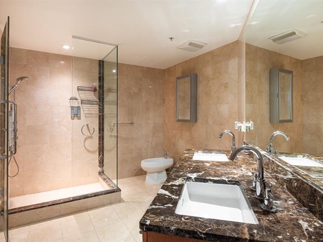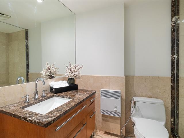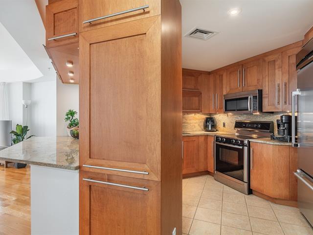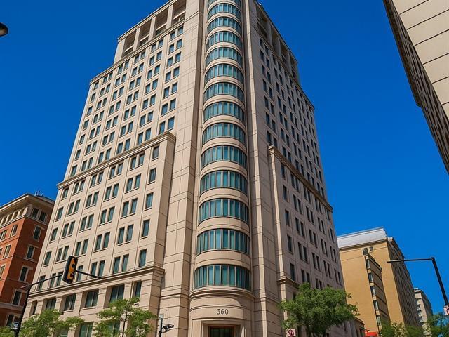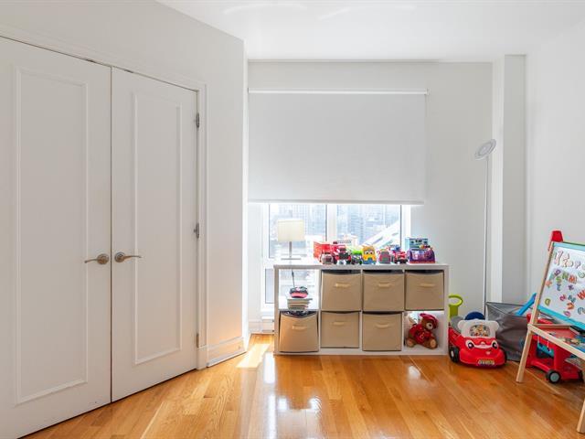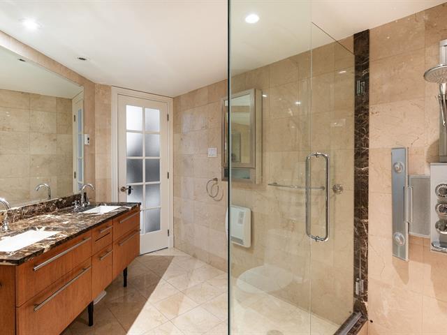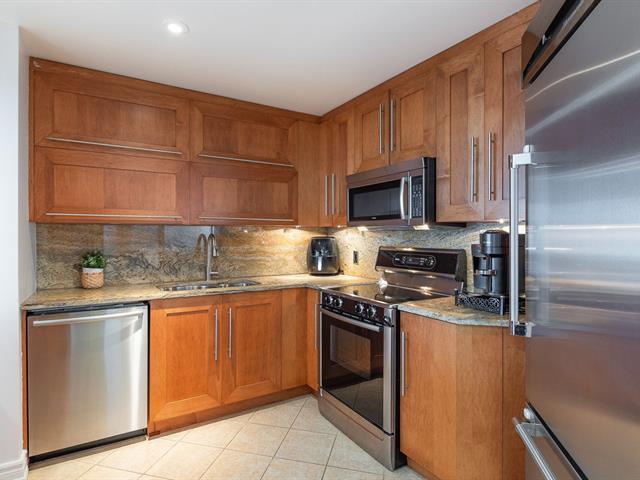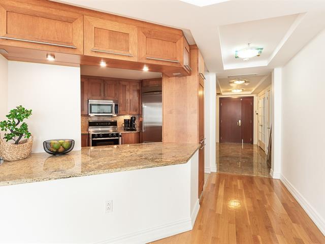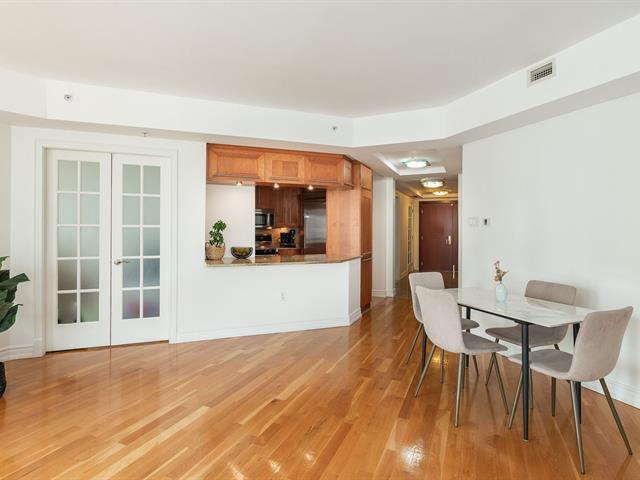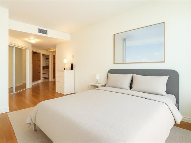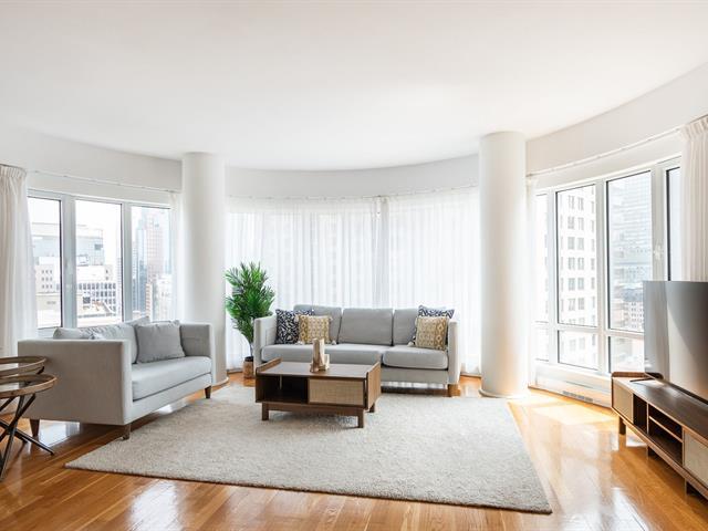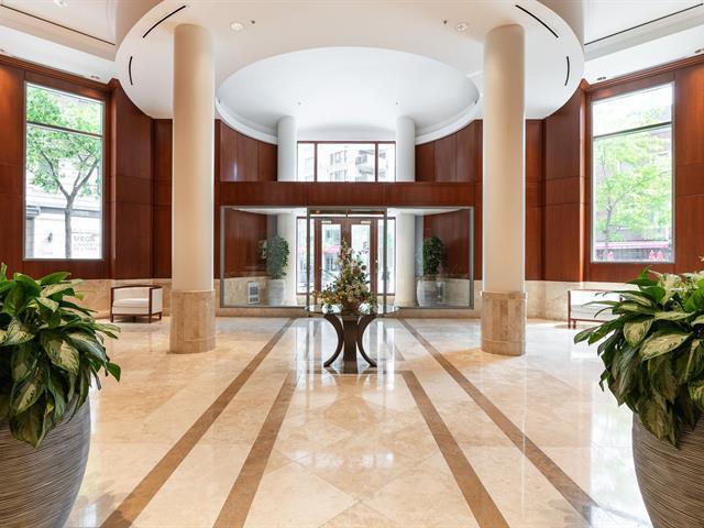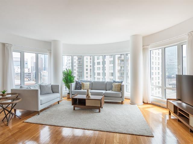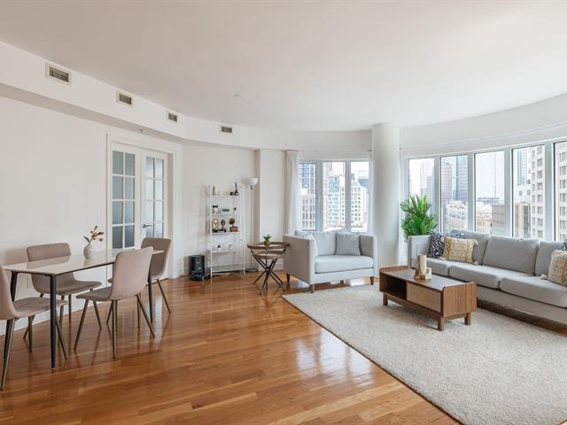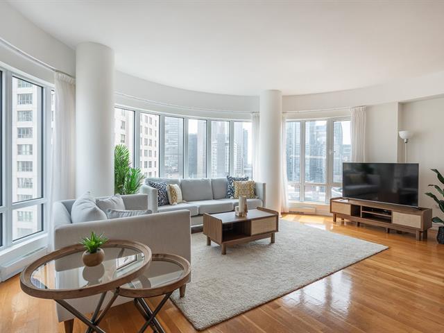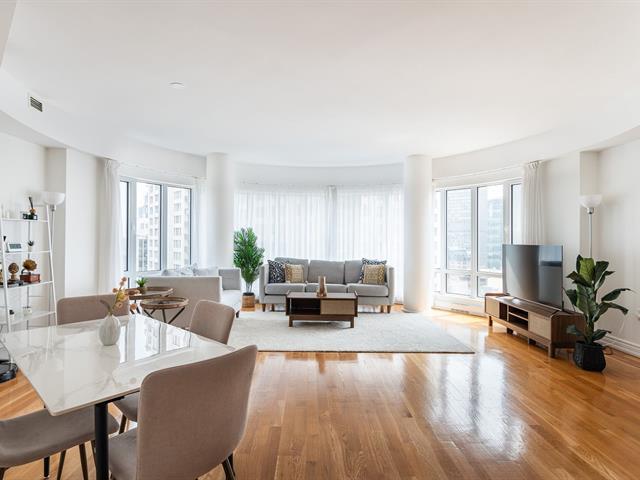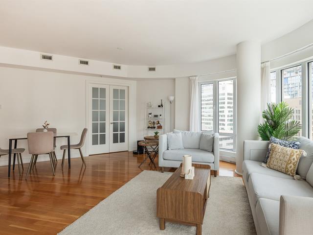 2 GARAGES INCLUDED! Prestigious building located in the heart of the Golden Square Mile on the 15th floor, this corner unit located in the rounded section and fully windowed offers a magnificent view of downtown and plenty of natural light. Open concept living and dining room. Semi-enclosed kitchen with stainless steel appliances, granite countertops and backsplashes. 2 bedrooms and 2 bathrooms, a storage space included. RENTED UNTIL JUNE 30th 2026. Reputable building with several services: doorman, visitor parking, rooftop terrace, swimming pool, gym, etc. (46928436)