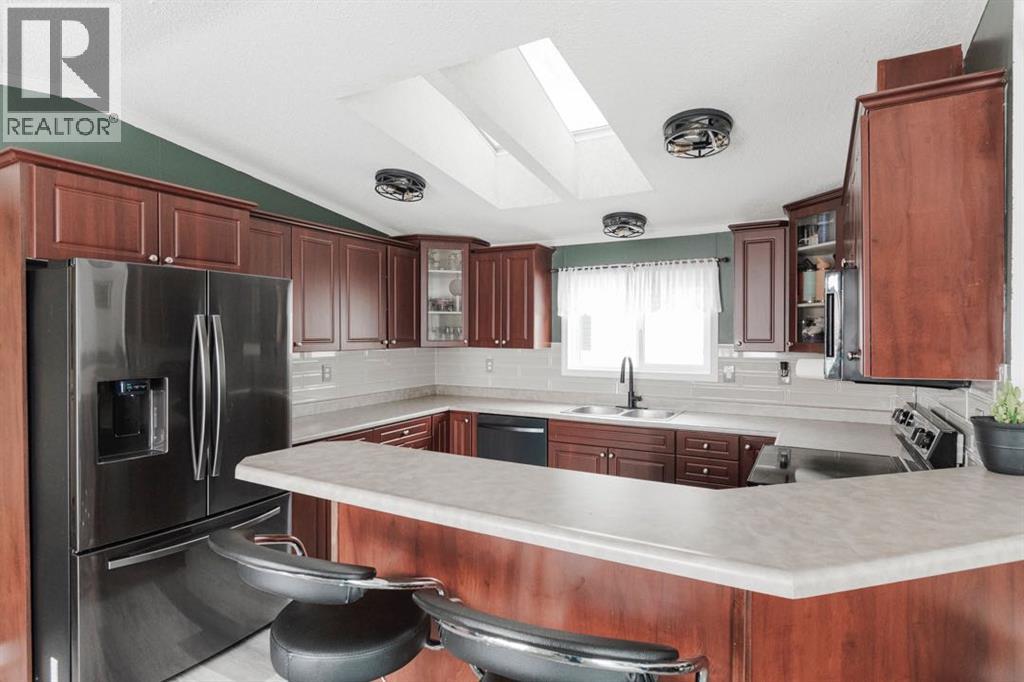 Open House: Saturday February 28th 11:00am-12:30pm | Welcome to 153 Lodgepole Way: a spacious 1,414 sq ft double wide manufactured home built in 2007, offering a functional open concept layout and the added bonus of no condo fees. With four bedrooms and numerous recent updates, this larger floor plan provides flexibility and comfort for families, professionals, or down-sizers seeking space without compromise.The bright and inviting main living area features new vinyl plank flooring installed in 2022 and updated lighting completed in 2023. The home was freshly painted in 2024, creating a modern and well maintained feel throughout. The kitchen showcases dark stainless steel appliances, including a newer washer and dryer, and a microwave that is only days old. A stylish tile backsplash was added one year ago, enhancing the space. The deep freeze will remain with the home.The layout includes four bedrooms, with the fourth bedroom currently used as a workout room and easily suited as a home office or flex space. New blinds were installed in the primary and front bedroom in 2022. A new sliding door was added in 2024, improving both functionality and natural light.Major updates include a hot water tank replaced in 2021, a new chimney completed in 2024, and repairs to the belly bag within the past four years along with the added bonus of Central A/C. Outside, the property offers a fully fenced yard with the exception of the front, crushed rock under the carport, and grass in the remaining yard space. The wired shed includes 240 volt power and attic storage, making it ideal for projects or additional storage. The carport and small tent at the back will remain, as will the gazebo and exterior permanent lighting.153 Lodgepole Way presents a move in ready opportunity with thoughtful upgrades and practical features throughout. Schedule your private showing today to experience everything this well cared for home has to offer. (31689742)