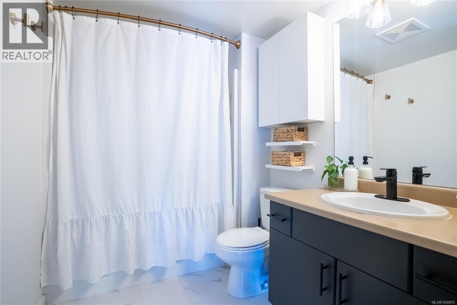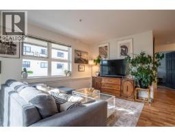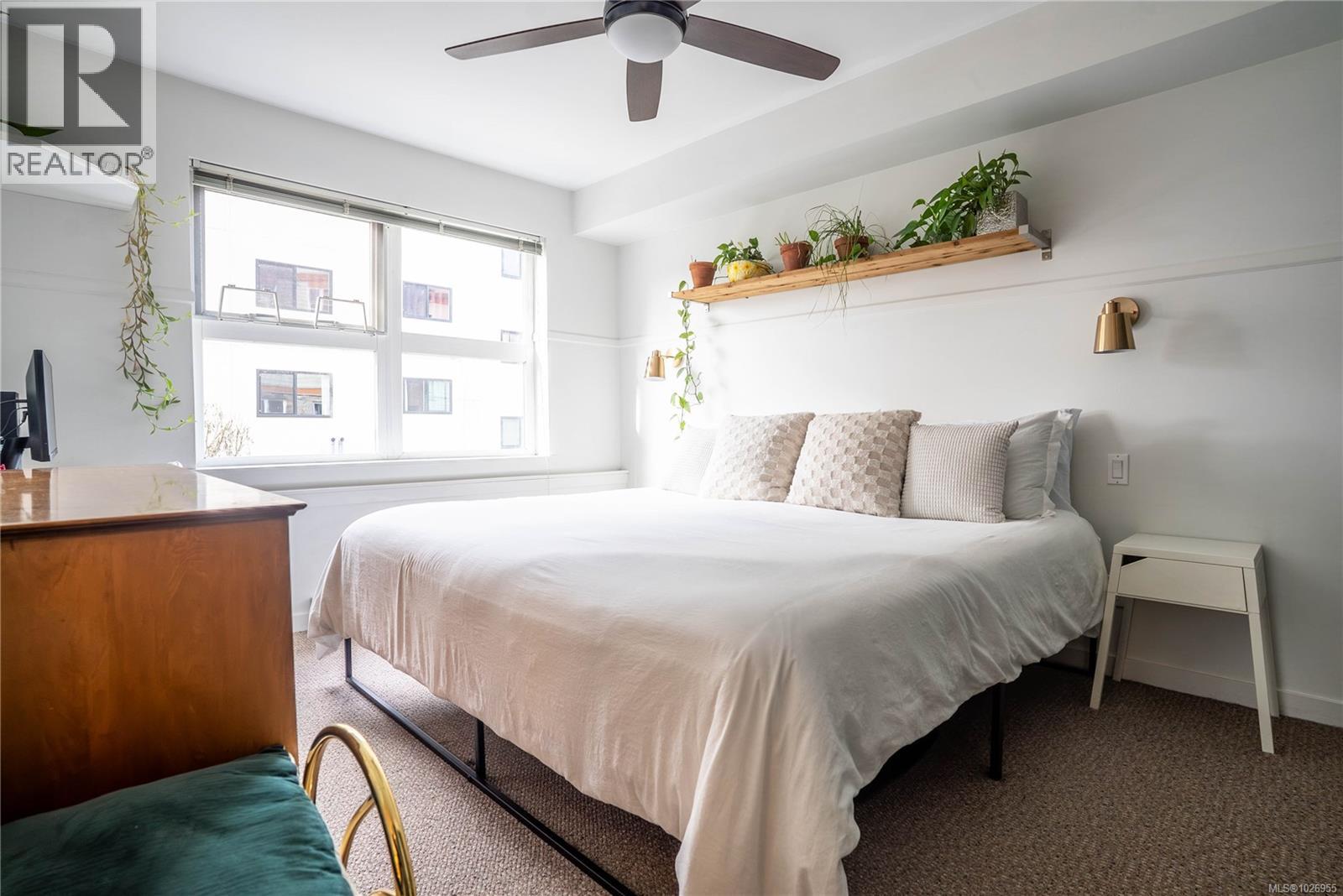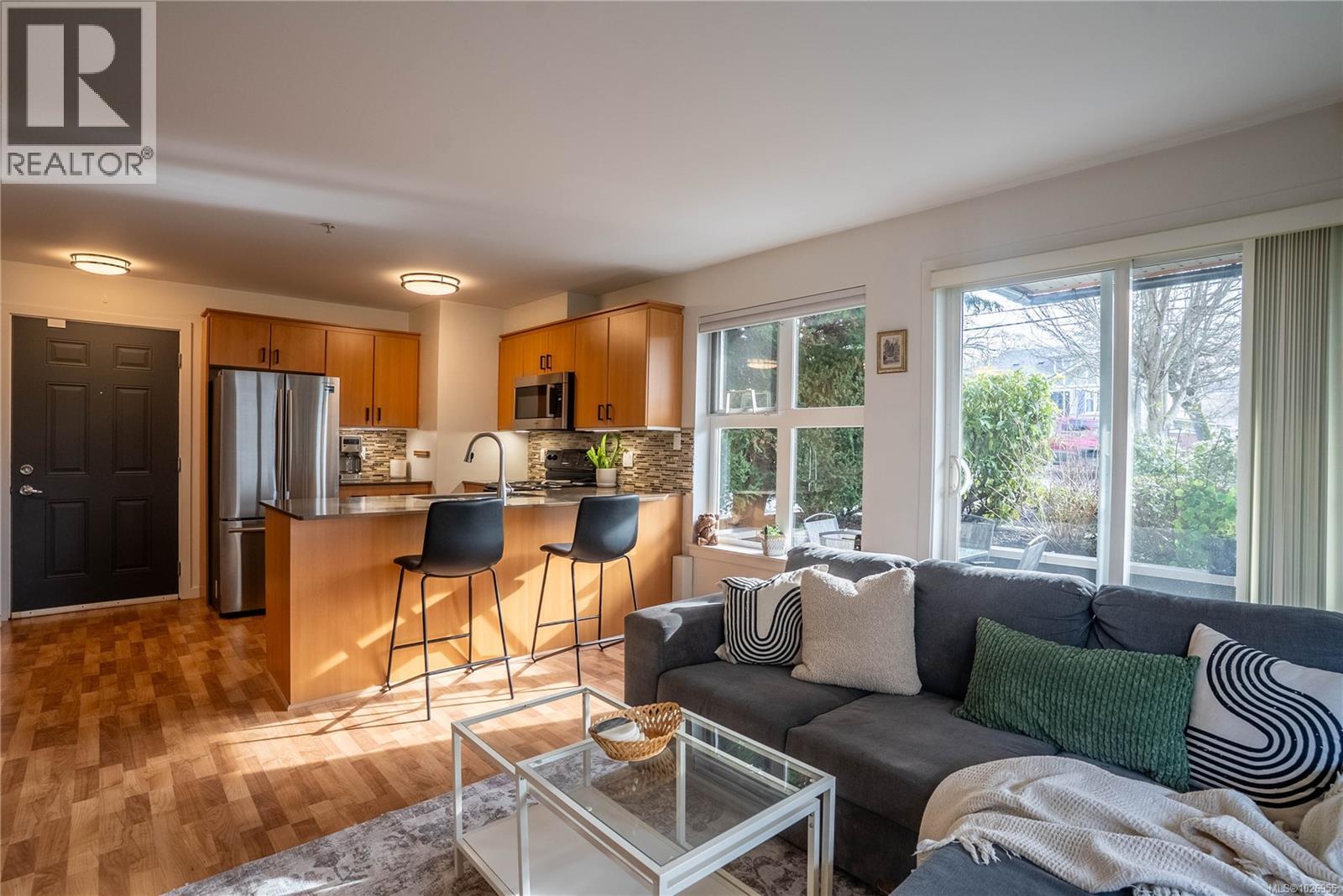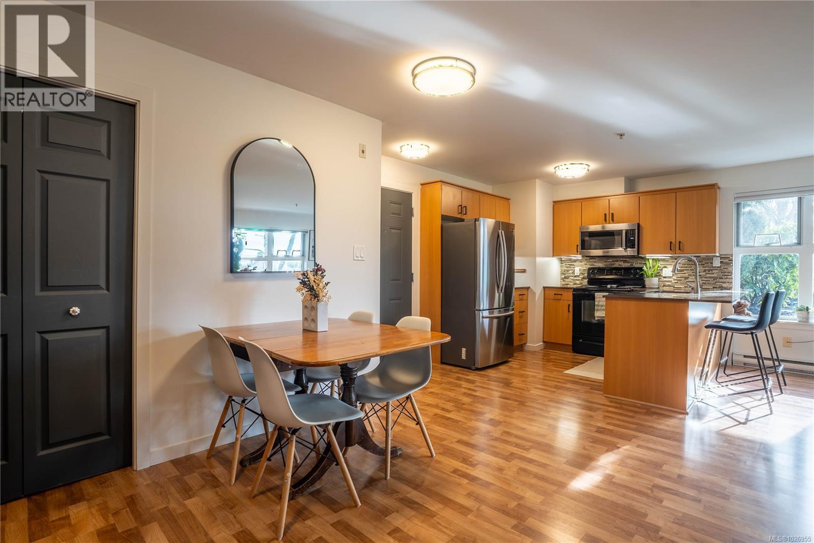 Welcome to this beautifully maintained and thoughtfully designed corner unit offering 721 sq. ft. of bright, functional living in a well-managed 2007-built building. This spacious 2-bedroom home features an open-concept layout with large windows that flood the living and dining areas with natural light. The modern kitchen is equipped with quartz countertops, tile backsplash, stainless steel appliances, ample cabinetry, and a generous island ideal for everyday living and entertaining. The inviting living and dining space flows seamlessly to a private, southeast-facing patio, perfect for morning coffee, outdoor dining, or relaxing in a quiet, landscaped setting. Laminate flooring enhances the main living areas, while the bedroom and den offer comfortable carpeted spaces ideal for rest, work-from-home, or guest use. The versatile den easily functions as a second bedroom or home office. The primary bedroom is well-proportioned with excellent closet space, and the updated bathroom features a tiled shower surround and modern fixtures. In-suite laundry adds everyday convenience, along with secure underground parking and a dedicated storage locker. Residents enjoy access to two secure bicycle storage rooms and a spacious rooftop patio with scenic views of the Gorge Waterway. The building is pet-friendly, rental-friendly, and has no age restrictions, making it an excellent option for homeowners and investors alike. Ideally located just minutes from downtown Victoria, Selkirk Waterfront, walking trails, parks, shopping, restaurants, and transit, this home offers outstanding lifestyle convenience in a central setting. A move-in-ready opportunity that combines comfort, functionality, and location—this property is a must-see. (30429663)