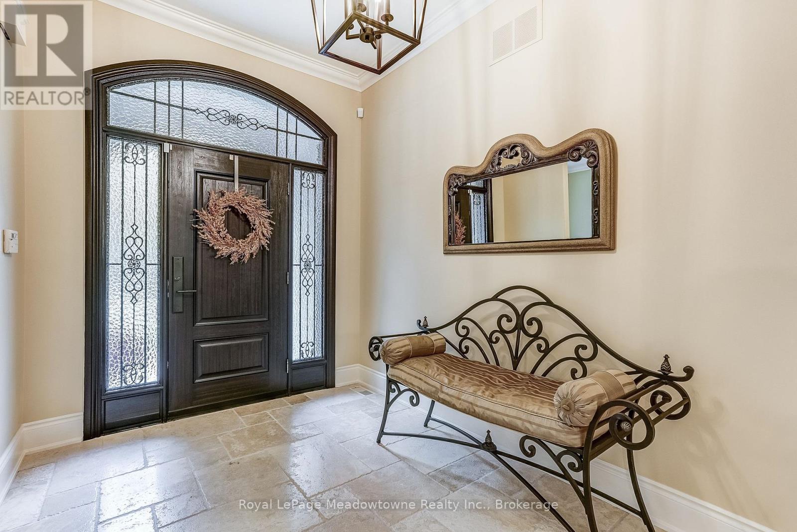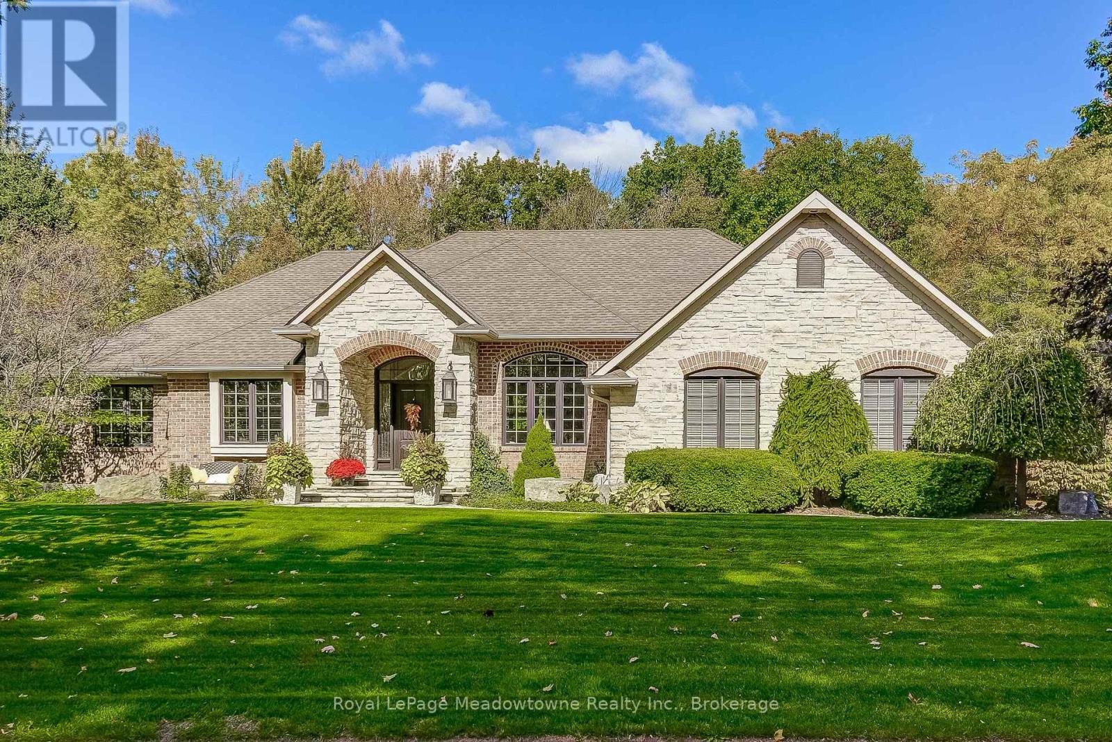 This well maintained executive 4 (3+1) bedroom custom BUNGALOW with approximately 4470sf of beautifully finished living space combines rural serenity with urban conveniences: a perfect blend of country living and luxury. It is situated on a much sought-after cul-de-sac nestled in the quaint village of Carlisle. The manicured half-acre+ lot backs and sides on to beautifully treed conservation lands. The semi-open concept main floor has been freshly painted throughout, and features an integrated living area consisting of a well-appointed and fully updated eat-in kitchen with 2 magnificent islands accommodating seating for 10 with high-end appliances (Miele oven/speed oven combo and dishwasher +Jen-Air fridge), and a family room with a stone façade gas fireplace framed by complementary book shelving and cabinetry. The elegant custom cabinetry offers an abundance of storage. This level also includes an inviting living room and an oversized dining room accented by a beautiful coffered ceiling. The generously sized primary room retreat has a 5-pc. ensuite and walk-in closet. There is also a 5-pc. main bath, 2 bedrooms, a laundry room and a 2-pc. bath. Enjoy the luxurious heated limestone flooring that runs throughout the main level. The professionally finished basement, accessible also from the oversized double-car garage, is completed to the same high level of craftsmanship, with high ceilings and large windows. A 27'X37'rec room, a 4thbedroom, a 4-pc. bath, a utility room and 4 additional rooms can serve a variety of purposes. Updated light fixtures have been installed throughout. The extremely private back yard oasis has been beautifully landscaped to include a firepit, water feature, and multiple conversation areas well suited for large gatherings. A stunning custom outdoor room with an integrated large Masters type hot tub complements the private park-like setting. A sprinkler system assists in maintaining the grounds and extensive perennial gardens. (42226370)