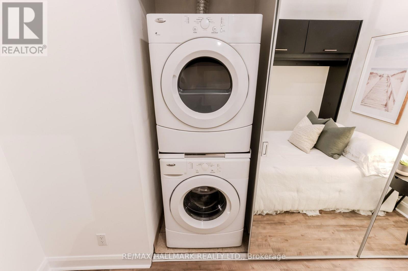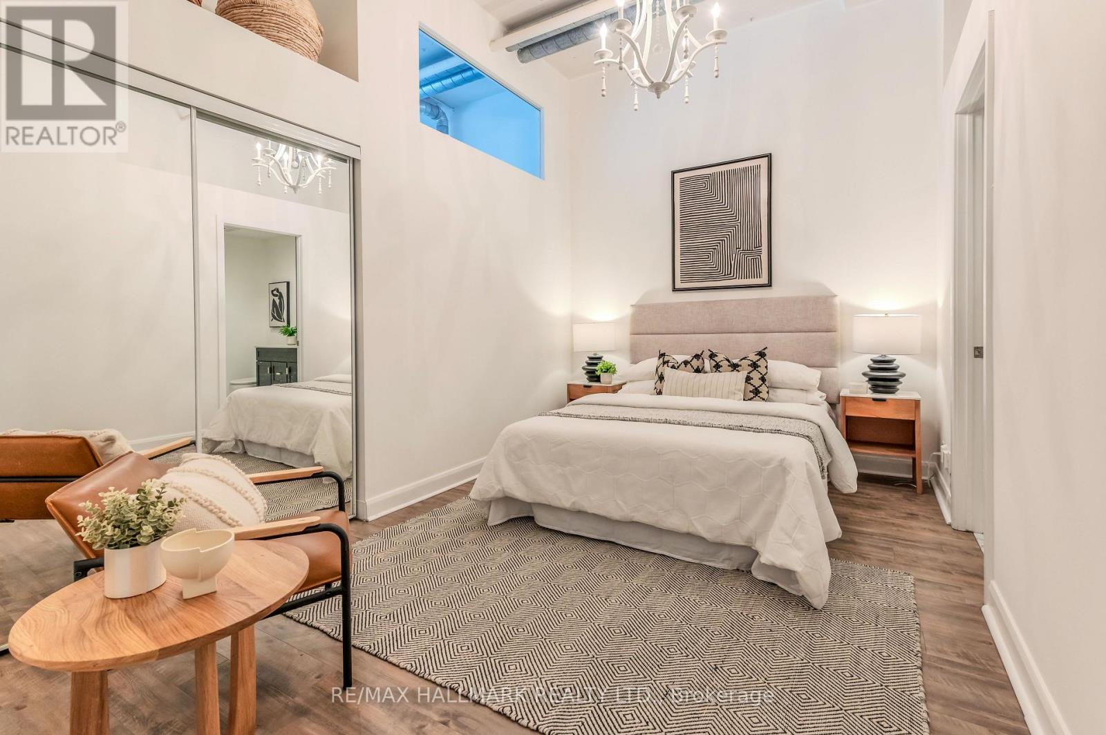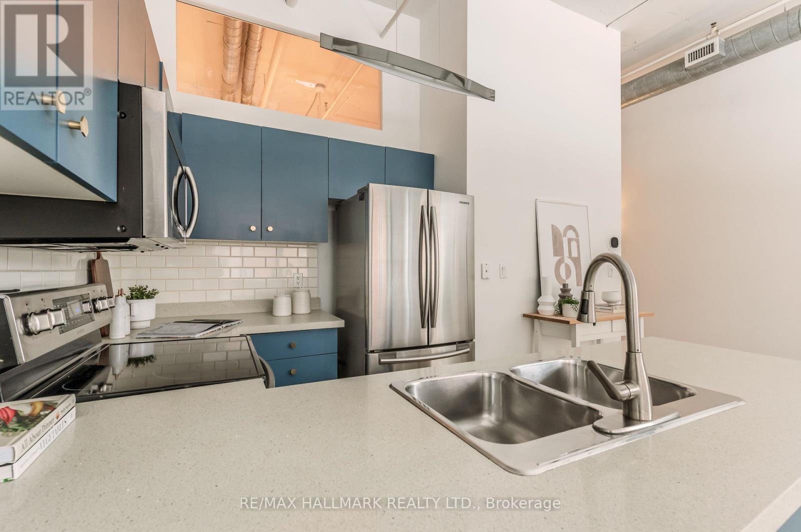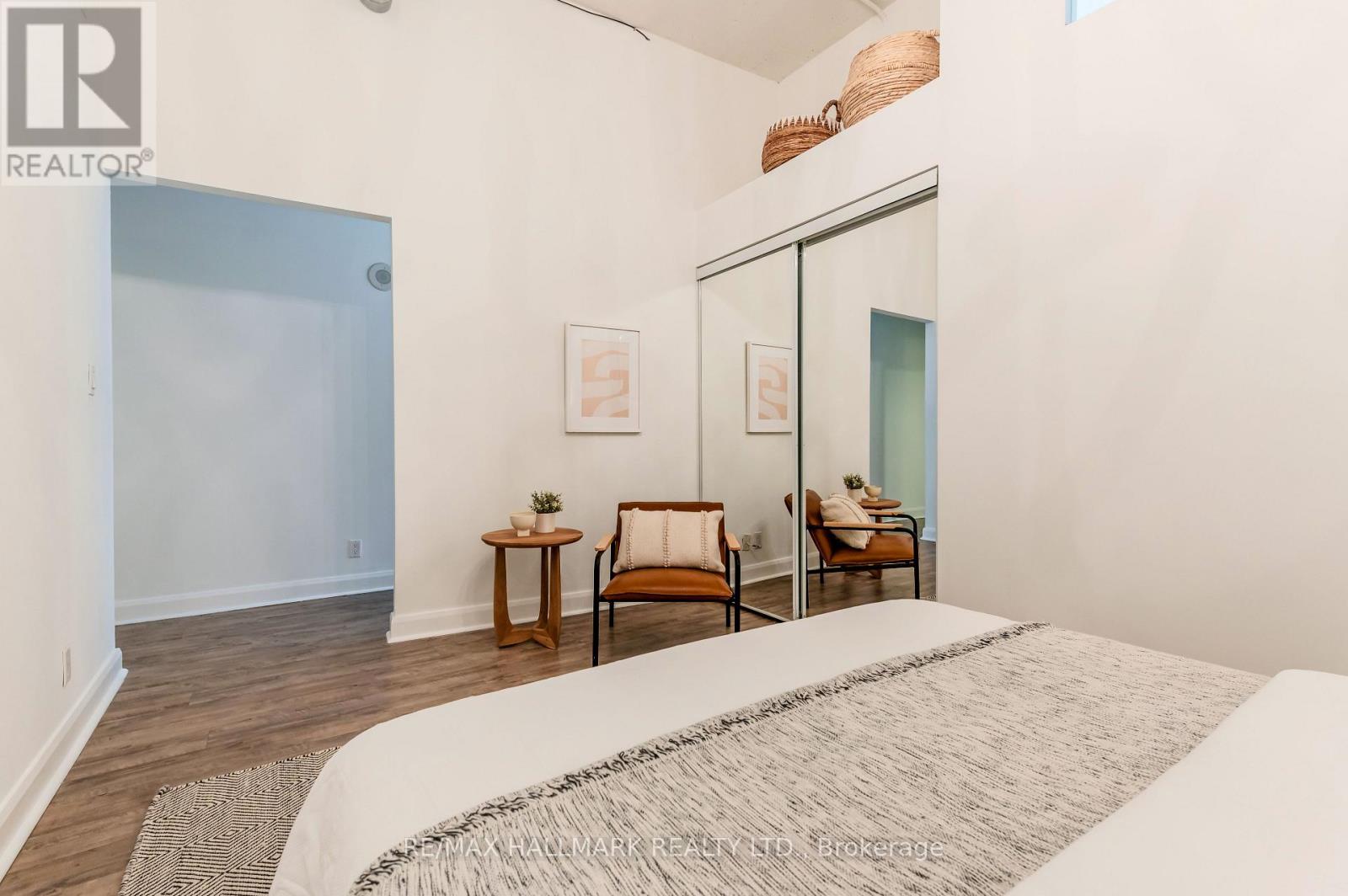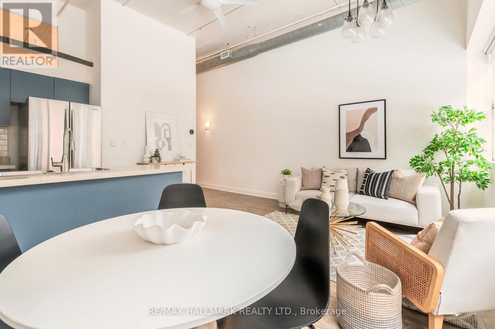 This stunning 2-bed, 2-bath loft offers 823 sq ft of authentic loft living with soaring 11-ft concrete ceilings, exposed ductwork, wide hallways and sliding doors that sets the tone from the moment you walk in. The open-concept layout features a well-appointed kitchen with custom cabinetry, tile backsplash and stainless steel appliances, flowing into a generous living and dining area filled with natural light. Conveniently located on the 2nd floor on the quiet side of the building, its two bedrooms offer flexible living. Two bedrooms with updated wardrobes, two full bathrooms with newer vanities (2022), en-suite laundry, 1 parking and an oversized locker located directly across from the unit all add to the convenience. What surprises everyone: how quiet it is. The building's solid concrete construction is legendary for its soundproofing - you'd never know you're at King and Bathurst while still reaping the benefits of this central location. (42228097)