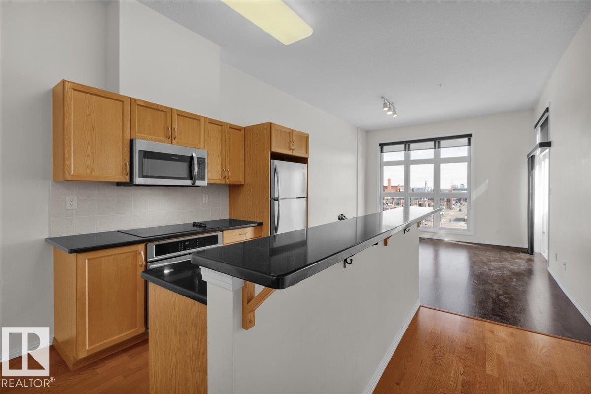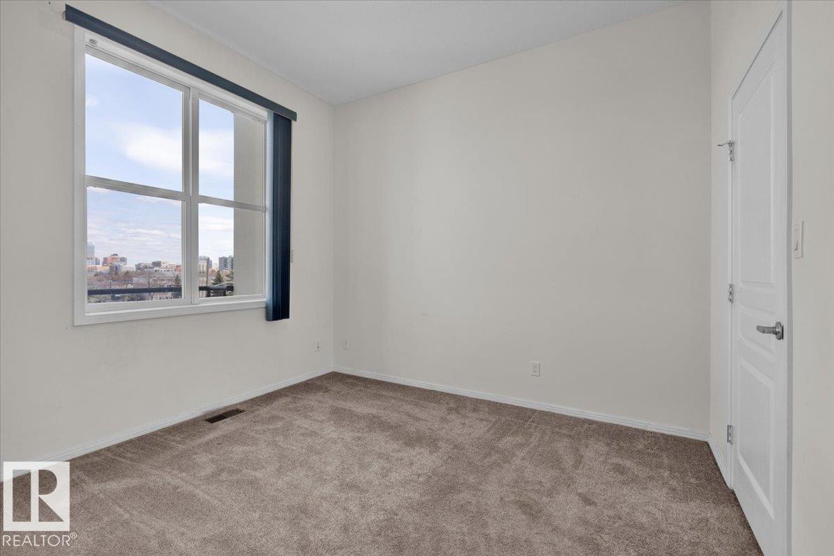Top-floor condo at Glenora Gates with unobstructed downtown views in the heart of Edmonton — Low condo fees and Pet-friendly building, it's perfect for first-time buyers, students, or investors! This bright unit features soaring 10-foot ceilings with large East-facing windows, equipped with modern blinds, that fill the space with natural light. Unbeatable location just steps from 124th Street, Manchester Square, Brewery District, Roger's place, MacEwan, and more — Great access to local shops, restaurants, gyms...etc. The upcoming Valley West LRT station is less than a block away for quick access to anywhere in the city. Everything you need right at your doorstep! Multiple River Valley trails are just blocks away. Upgrades include a newer carpet in the Bedroom, engineered hardwood, quartz countertops in the kitchen with a breakfast bar, newer SS appliances, Central A/C for the HOT summer months, & HWT replaced in 2018. Comes with a secure Underground parking stall and private storage cage. Don't Miss Out! (33879484)