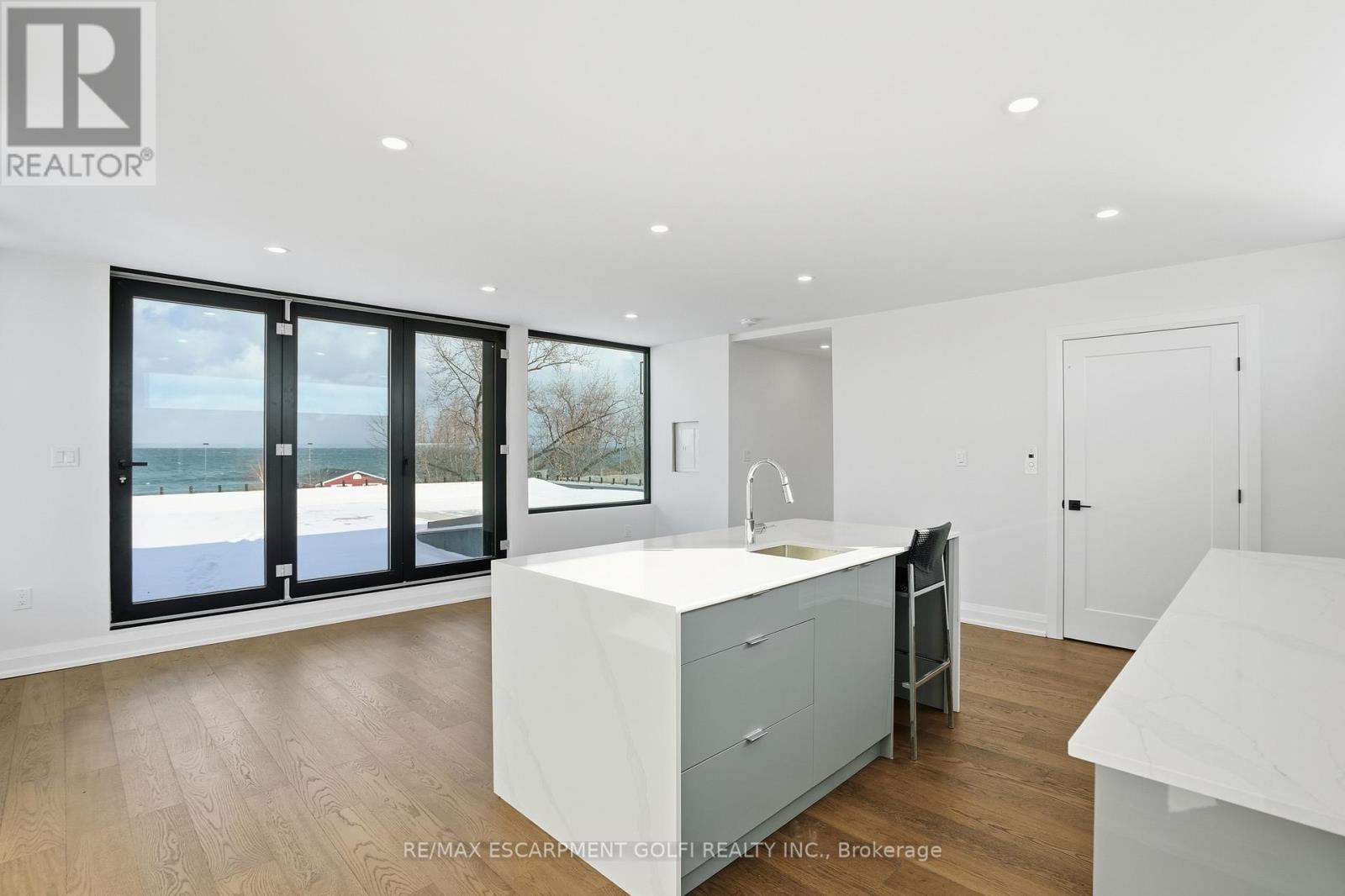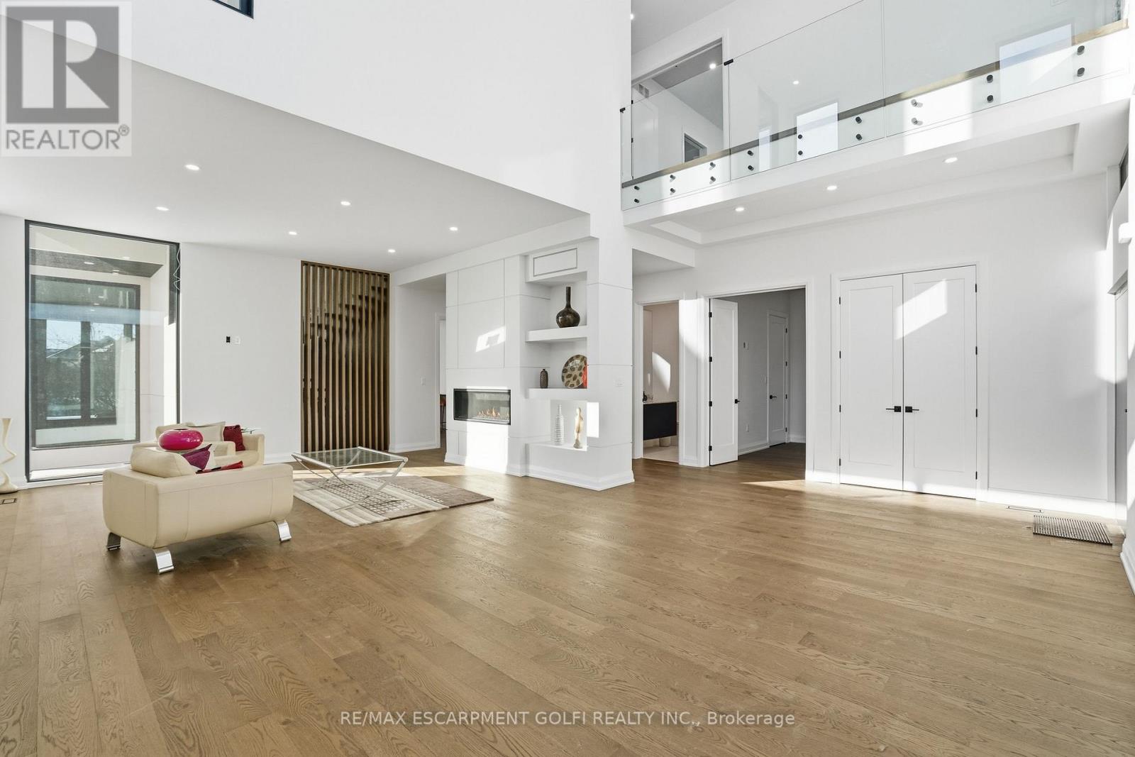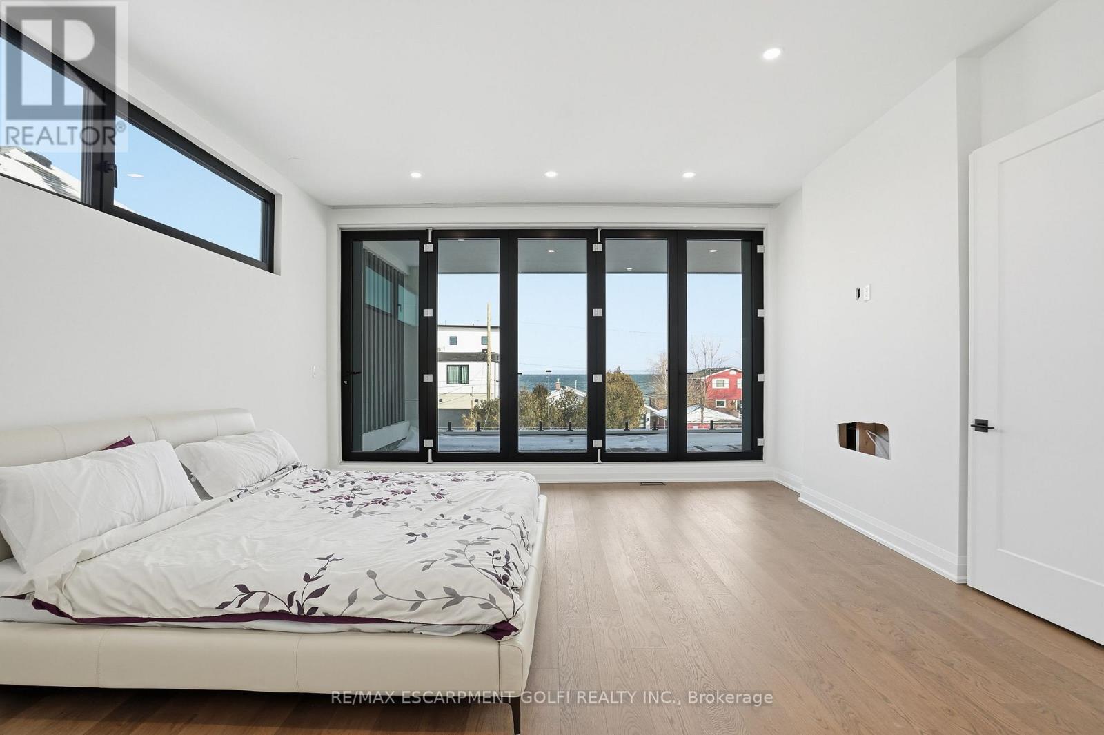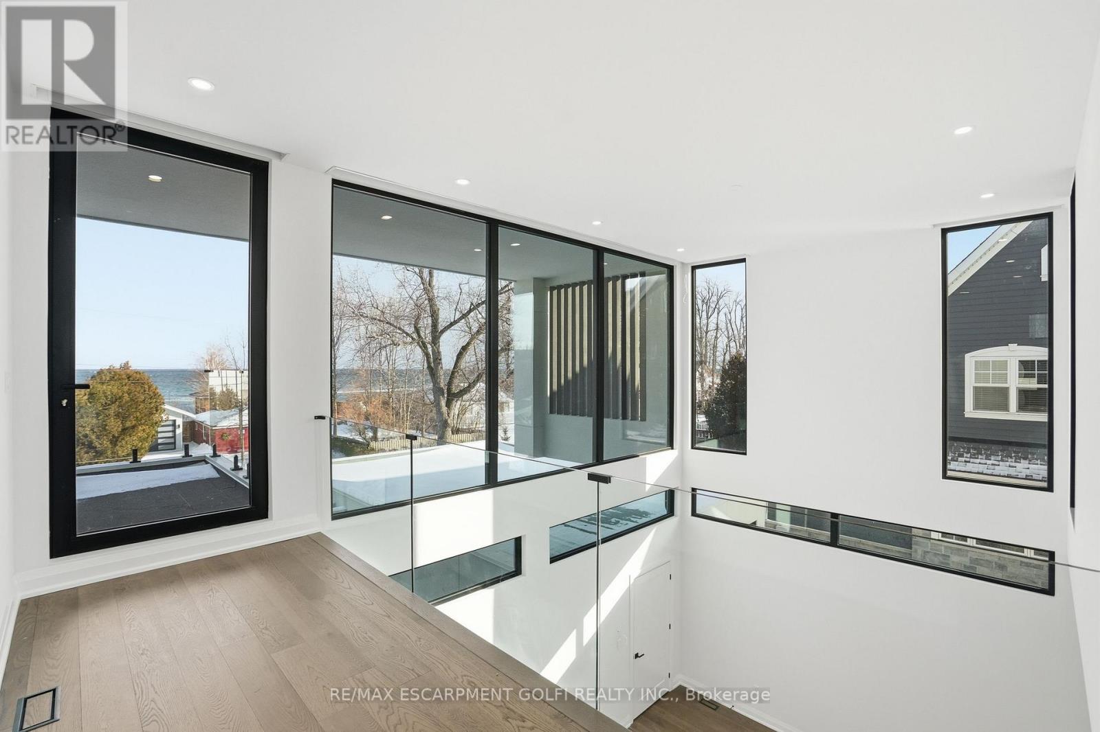 An exceptional newly built residence in Stoney Creek, completed in 2025 and offering nearly 6,000 square feet of refined living space. Designed to maximize natural light, the home features expansive floor to ceiling windows, clean contemporary lines, and elevated finishes throughout. A private elevator provides seamless access to all levels. The main floor opens into a dramatic two storey living room and flows into a statement chef's kitchen with waterfall island and fully equipped prep kitchen. Dining and family rooms are framed by floor to ceiling bifold doors leading to a covered deck and spacious backyard, creating effortless indoor-outdoor living. A private office and powder room complete the level. Upstairs, four bedrooms each offer private ensuites, while the master bedroom features bifold doors to a covered balcony with lake views, a generous walk in closet, and a spa inspired bath with soaker tub. The third level includes a kitchenette and rooftop terrace with uninterrupted Lake Ontario views. The bright basement offers a large rec room with full glass walkout, two bedrooms with shared ensuite, private office, and additional powder room. A rare opportunity for contemporary luxury in a premier lake oriented community. (42229302)