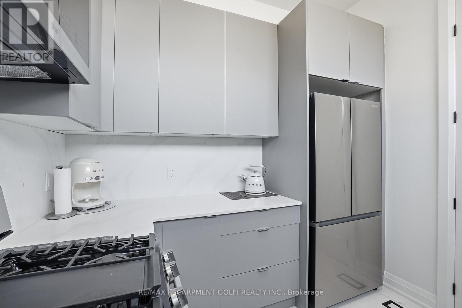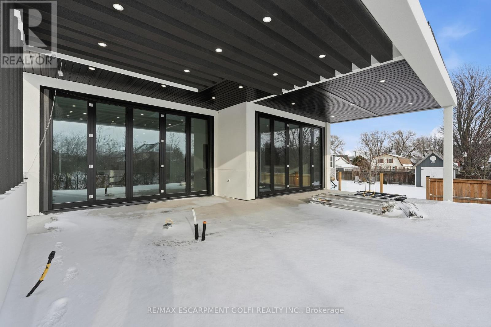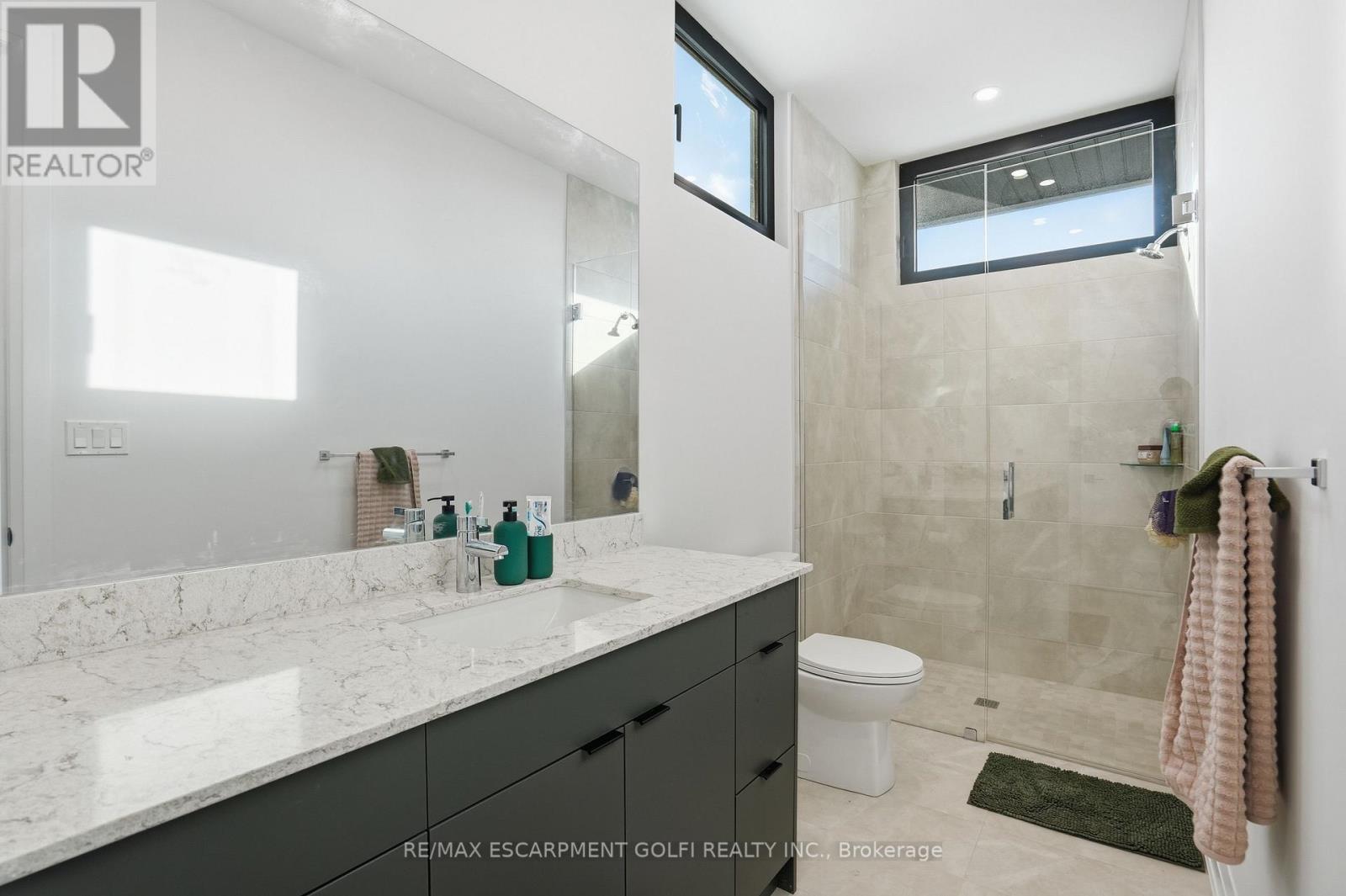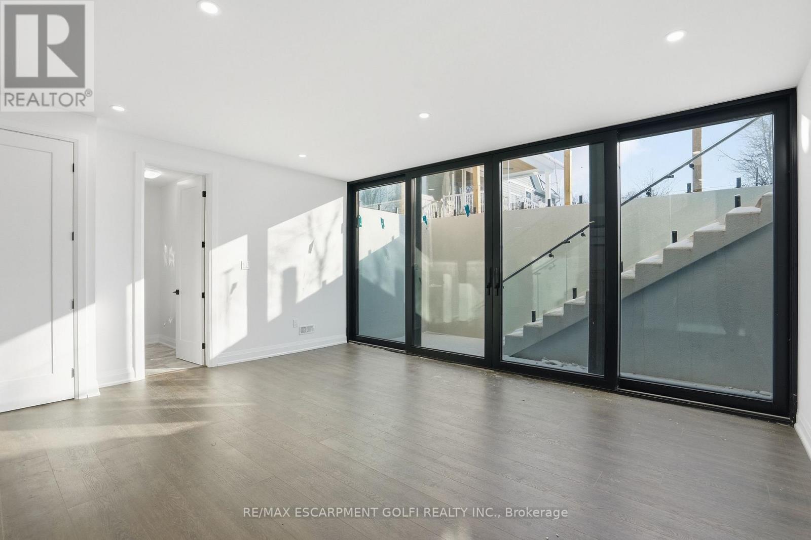 An exceptional newly built residence in Stoney Creek, completed in 2025 and offering nearly 6,000 square feet of refined living space. Designed to maximize natural light, the home features expansive floor to ceiling windows, clean contemporary lines, and elevated finishes throughout. A private elevator provides seamless access to all levels. The main floor opens into a dramatic two storey living room and flows into a statement chef's kitchen with waterfall island and fully equipped prep kitchen. Dining and family rooms are framed by floor to ceiling bifold doors leading to a covered deck and spacious backyard, creating effortless indoor-outdoor living. A private office and powder room complete the level. Upstairs, four bedrooms each offer private ensuites, while the master bedroom features bifold doors to a covered balcony with lake views, a generous walk in closet, and a spa inspired bath with soaker tub. The third level includes a kitchenette and rooftop terrace with uninterrupted Lake Ontario views. The bright basement offers a large rec room with full glass walkout, two bedrooms with shared ensuite, private office, and additional powder room. A rare opportunity for contemporary luxury in a premier lake oriented community. (42229302)