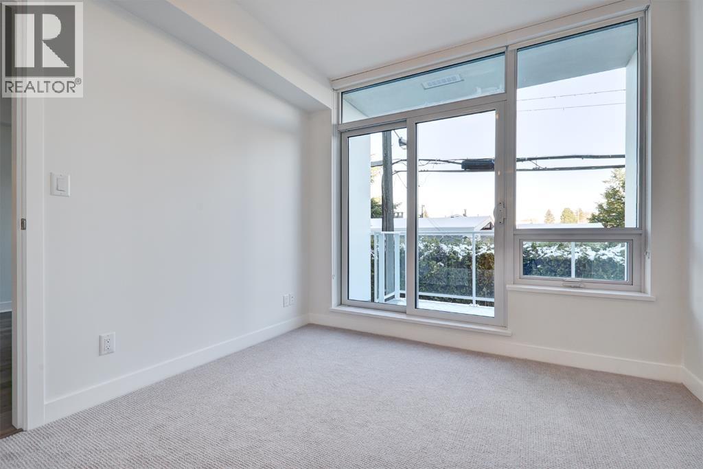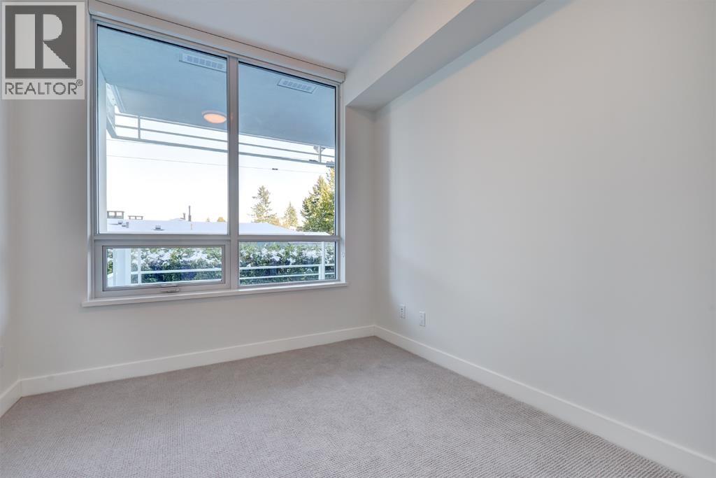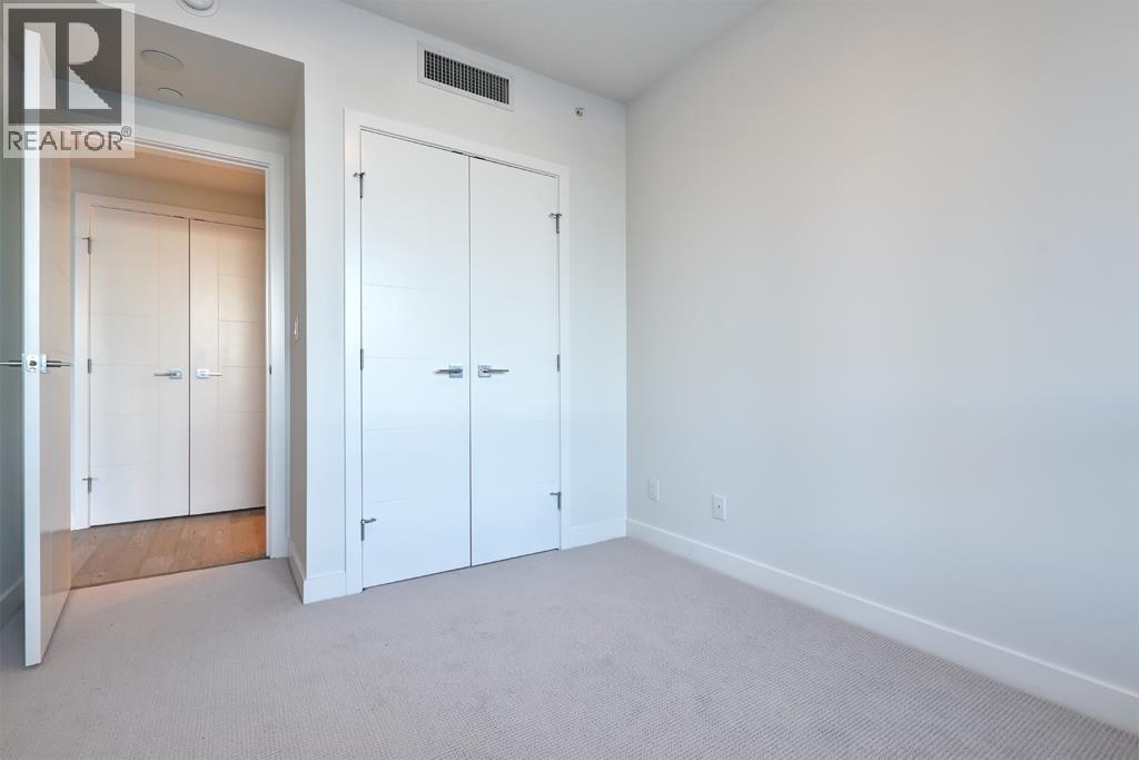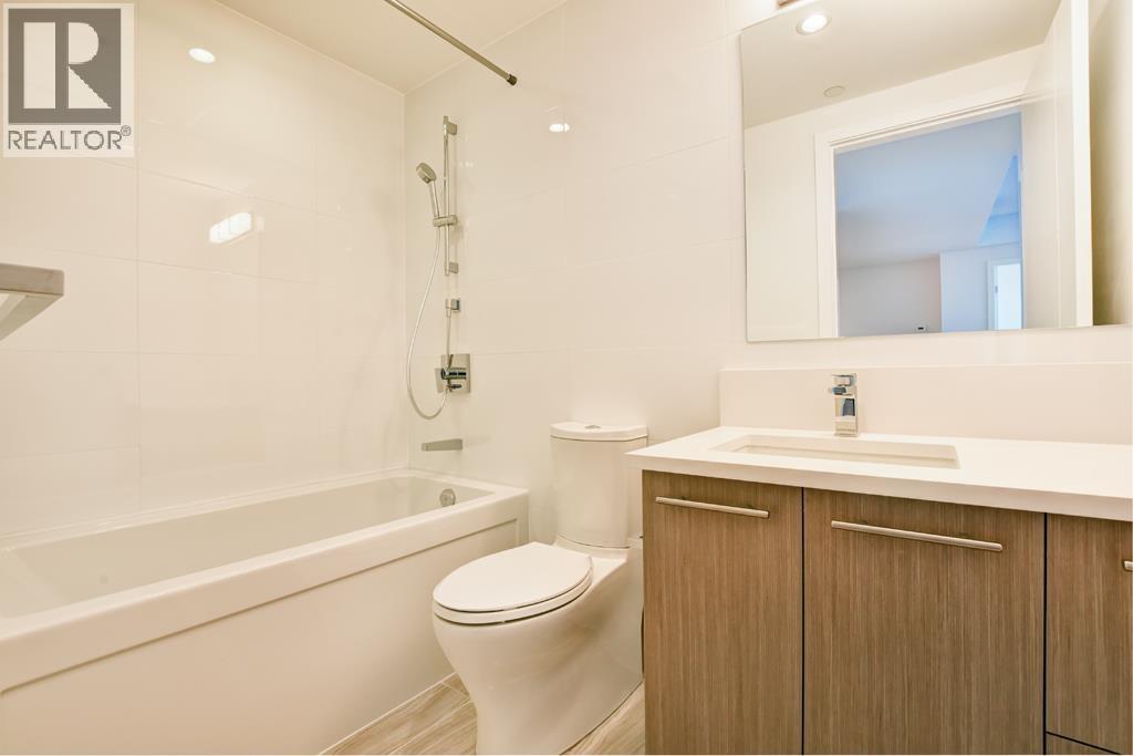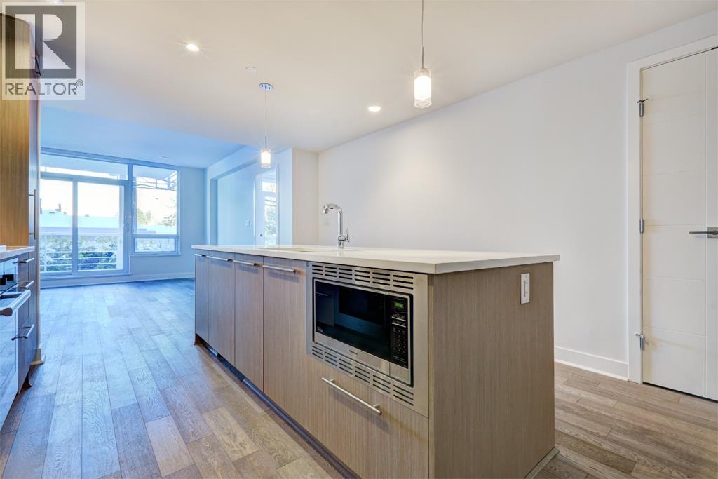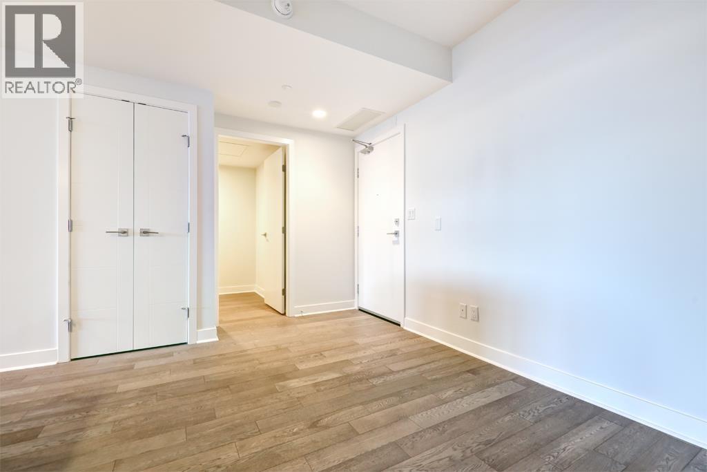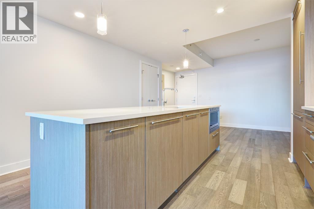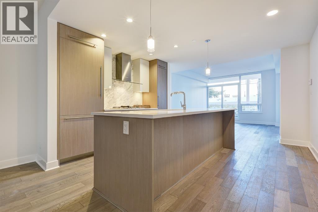 This 1025sf, 2-bed+den condo boasts a unique layout, featuring a spacious family room leading to a large living area with a modern gourmet kitchen at its center. Highlights include 9' ceilings, central air, hardwood floors, and roller blinds. The living room opens to a sizable balcony. The kitchen offers wood-grain laminate cabinetry, quartz countertops, and high-end Miele appliances. The primary suite spans one side with a bedroom, private balcony, walk-through closets, and a luxurious 5 pcs ensuite. The 2nd bedroom, 2nd bathroom, and in-suite laundry occupy the opposite side. Both bathrooms showcase wood-grain cabinets, quartz countertops, porcelain tiles, and Kohler fixtures. A small den in the family room serves as an office. Rent includes 1 parking stall and 1 storage locker. (32499684)