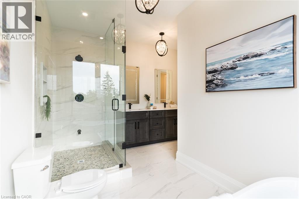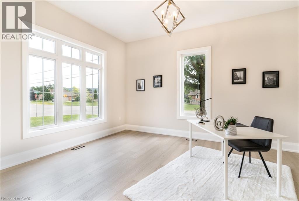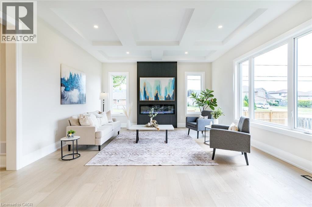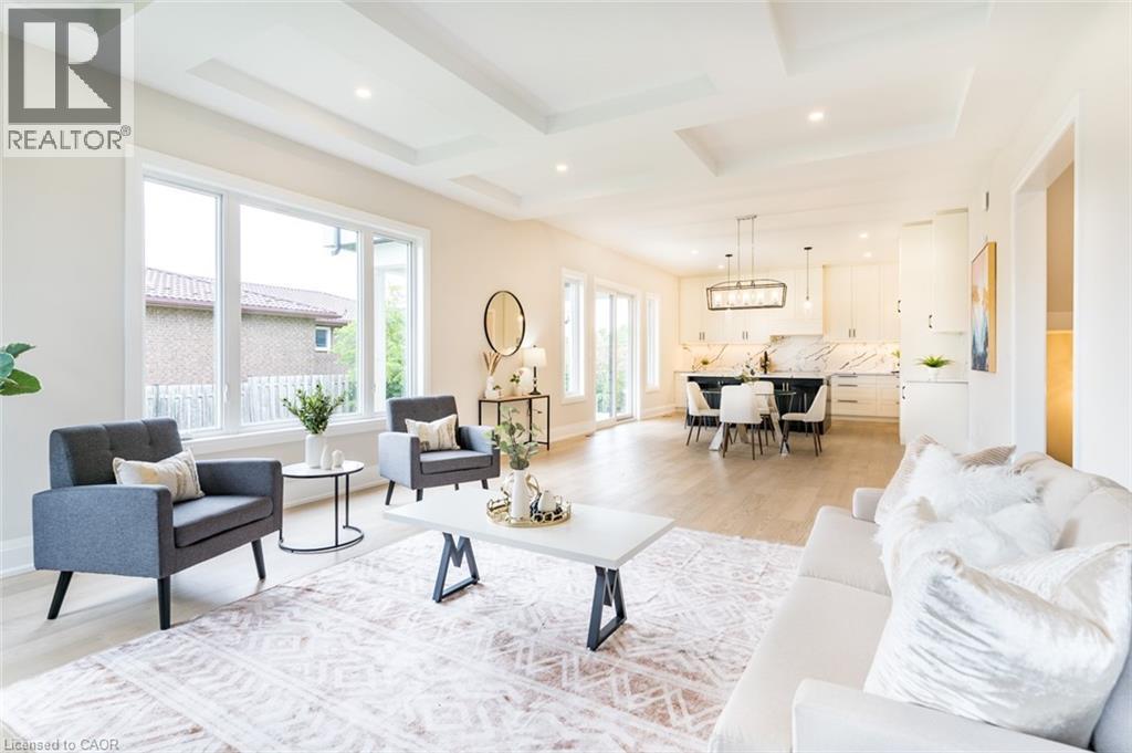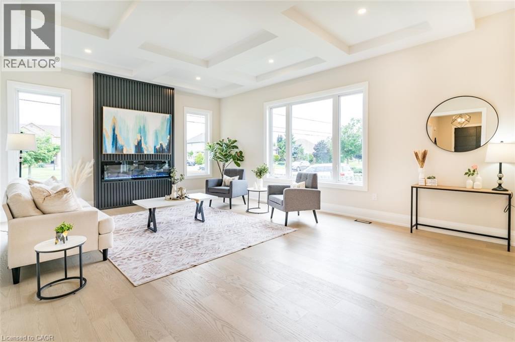 Welcome to a stunning modern 4,500 sq. ft. masterpiece where luxury and craftsmanship unite seamlessly. This custom two-story home epitomizes contemporary sophistication, offering an unparalleled living experience defined by soaring 10-foot ceilings on the main level and 9-foot ceilings upstairs. At the heart of the home is a sleek, designer kitchen featuring custom cabinetry with pull-out drawers, a dedicated servery, and an oversized walk-in pantry—a perfect blank canvas awaiting your personal choice of premium appliances. Adjacent is the expansive, open-concept living area highlighted by a striking coffered ceiling, an elegant electric fireplace, and breathtaking windows that bathe the space in natural light. The main level also features a private office behind grand 8-foot doors, offering a quiet retreat or ideal workspace. The finished basement, complete with a 2-piece bathroom and 9-foot ceilings, adds versatile space for recreation or fitness. Upstairs, the primary suite serves as a serene escape with a spacious walk-in closet and a spa-inspired 5-piece ensuite. A second bedroom features a private 3-piece ensuite, while two additional bedrooms share a well-appointed 5-piece bathroom. Step outside to a private backyard oasis with a covered patio, BBQ gas hookup, and lush landscaping. Additional high-end features include an oak staircase with iron spindles, a hardwired security system, and Wi-Fi access points on each floor. Located in a sought-after neighborhood just minutes from the QEW, a future GO station, and top-rated schools, this exceptional home offers the perfect blend of luxury and location. (70213828)