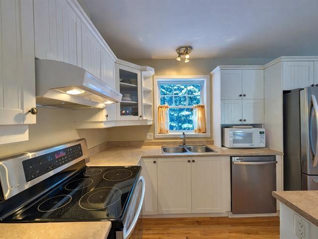 LAKE ARCHAMBAULT ACCESS just steps away. Located in a desirable and paved area, this property stands out for its peaceful setting and impeccable upkeep. It features two bedrooms plus a dedicated office, ideal for working from home or hosting family and guests. The flat, beautifully landscaped lot enhances the overall appeal, while the integrated garage and gas fireplace provide everyday comfort and convenience. Just minutes from the village of Saint Donat, local services, and Ski Garceau, this prime location allows you to fully enjoy the region in every season. (56628951)