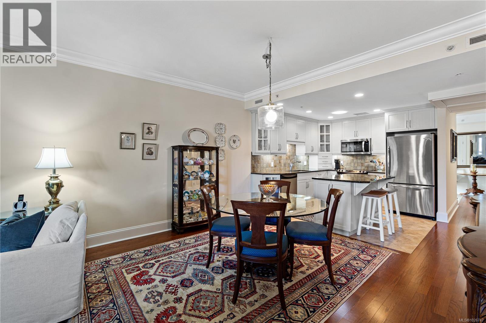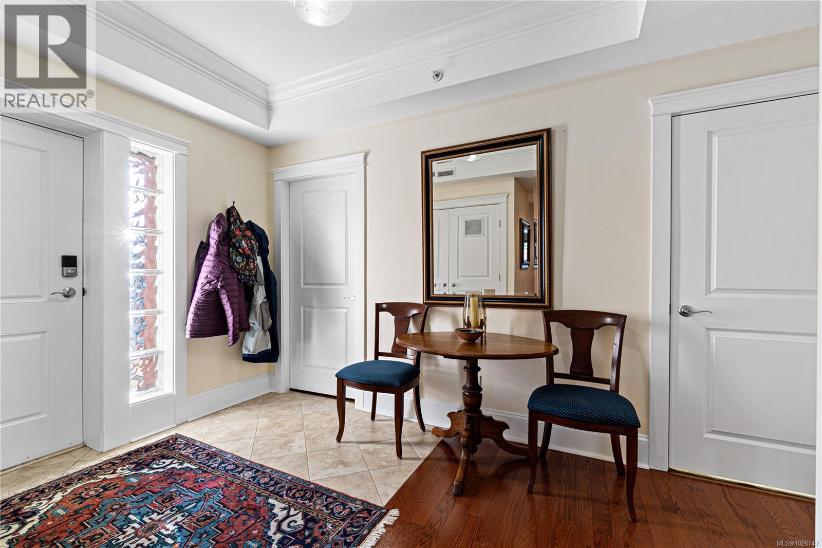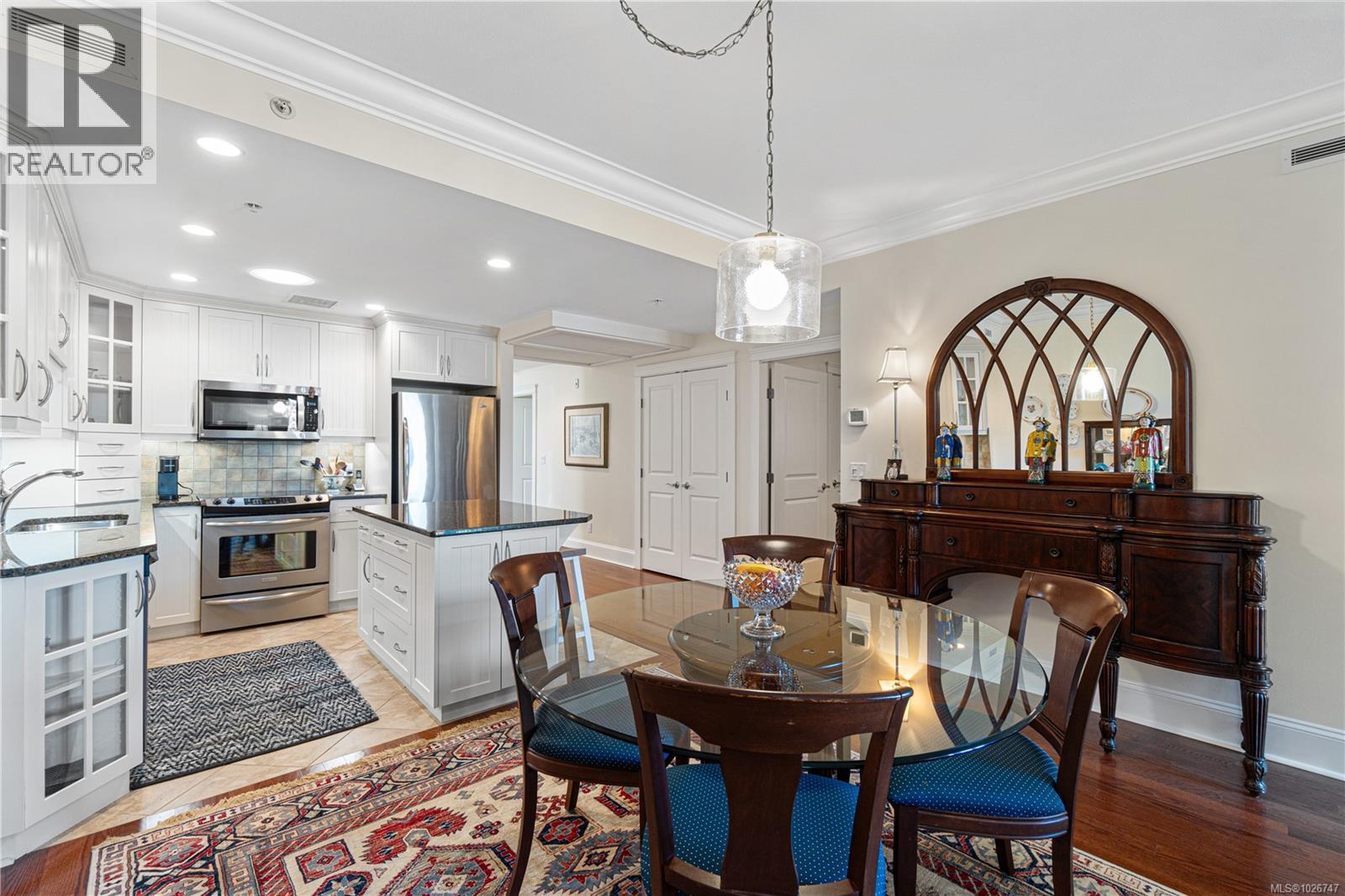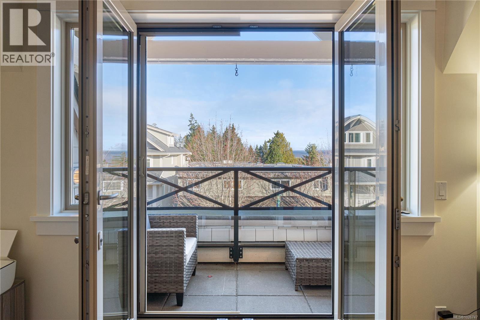 Ocean View Qualicum Beach Condo. This 55+ building ideally located in the center of town, is a large floorplan within the Villa Rose community. Offering 2 bedrooms and 2 bathrooms, this well-designed home combines spacious living with quality craftsmanship. Features include an open layout with hardwood floors, granite countertops, stainless steel appliances, crown mouldings, a fireplace, and a large kitchen island. Screened double French doors open to two balconies perfect for enjoying views of the Georgia Straight. The primary suite offers a walk-in closet and ensuite with heated floors. Concrete and steel construction provides soundproofing and security. Includes underground parking, coded elevator, bike storage, locker, and a landscaped courtyard. Steps to shops, dining, the pool, golf, walking trails, and the beach. (30435230)