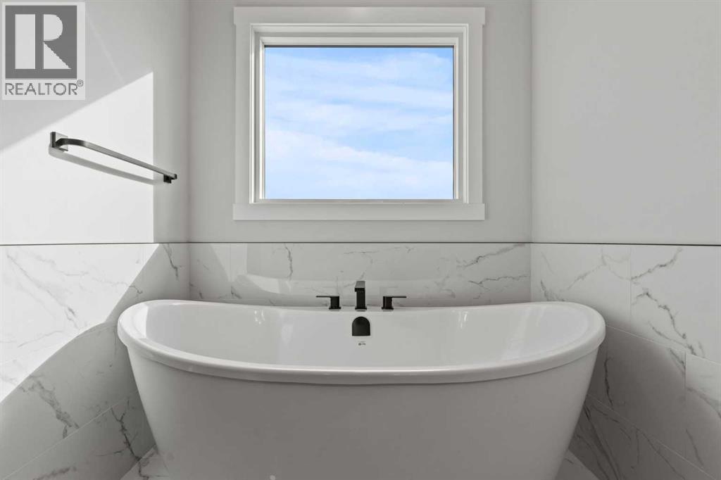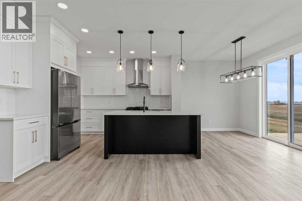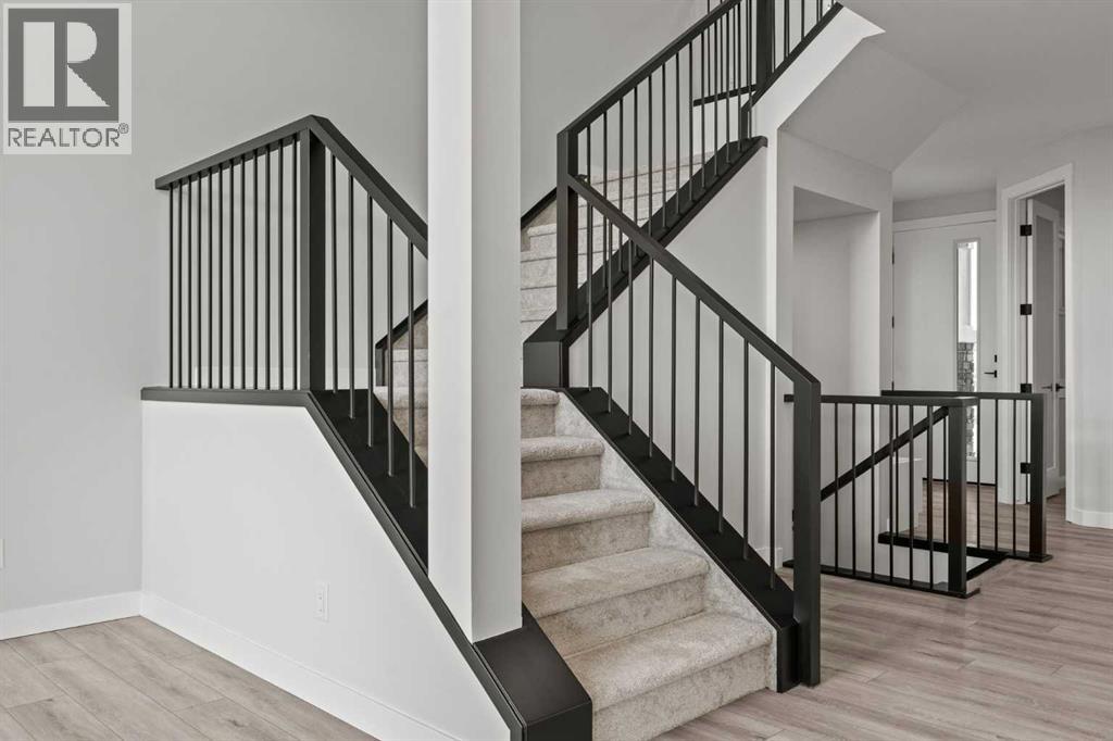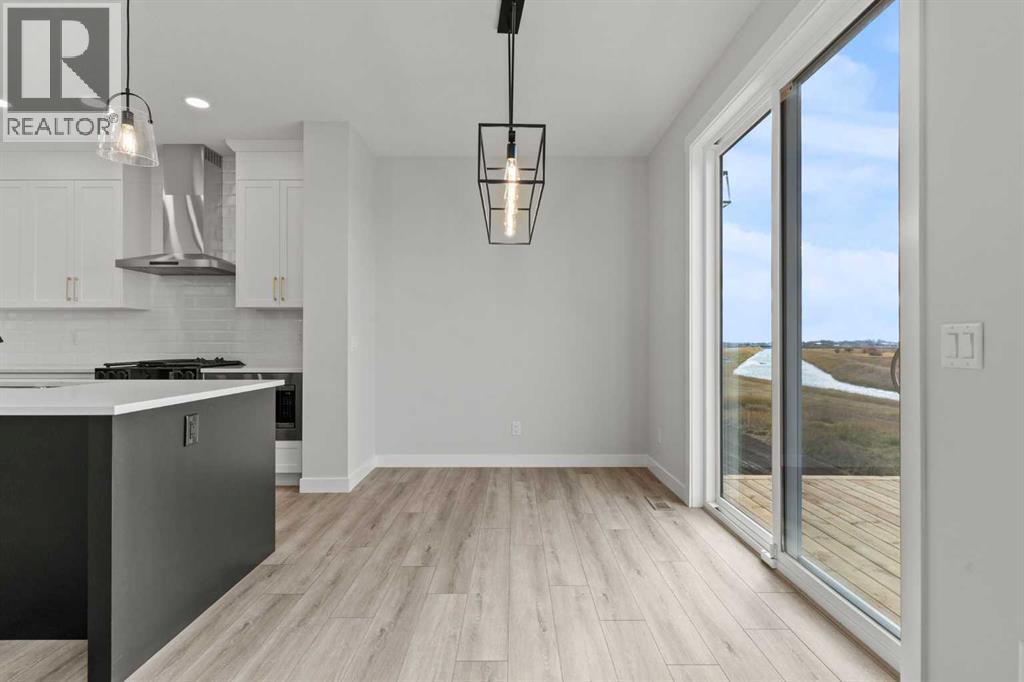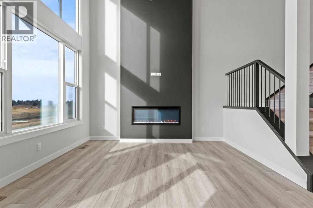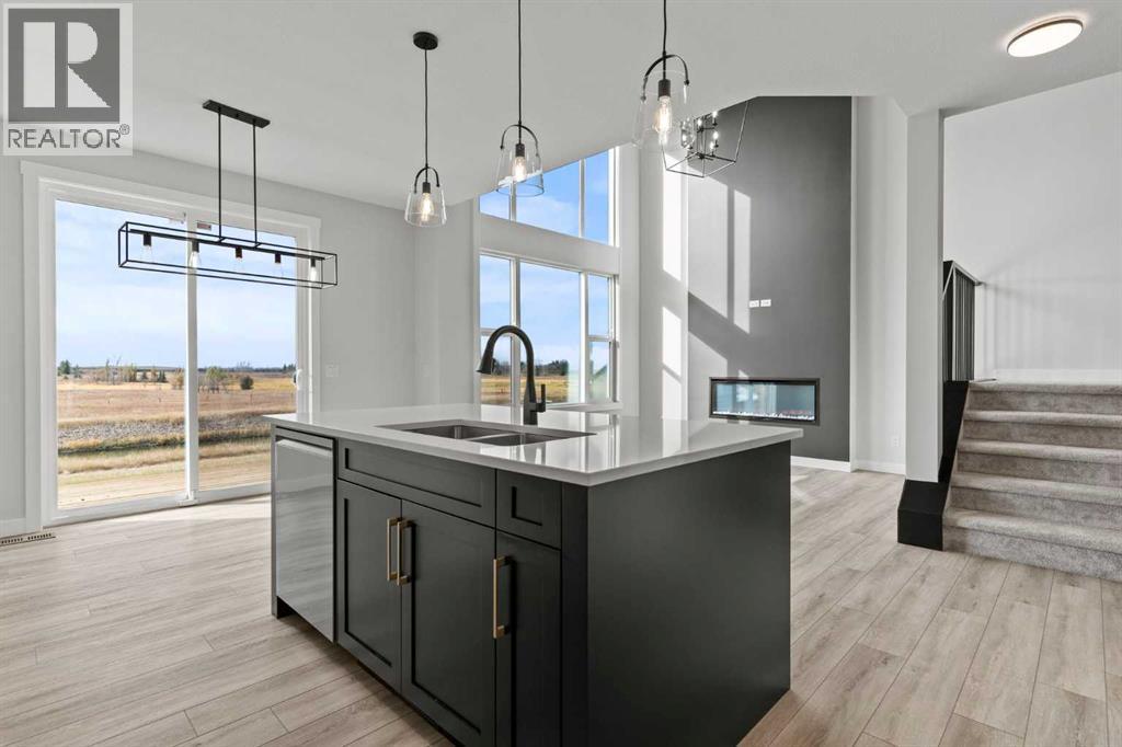 Welcome to 302 Kinniburgh Loop – A Stunning 6-Bedroom Walkout by Golden Homes in Kinniburgh South!Built by 5-star builder Golden Homes, this brand new home offers 3,088 SQFT of total developed living space across three levels — backing directly onto a walking and biking path and a tranquil pond, with unobstructed mountain views that make every day feel like a retreat. A rare opportunity in one of Chestermere's most sought-after communities.From the curb, this home stands out with its upgraded elevation featuring natural timber beams and sleek black windows, delivering bold, contemporary character. Inside, the open-concept main floor flows seamlessly through the family room that is open to below, dining area, and gourmet kitchen, complete with a large quartz island, full-height painted cabinetry, stainless steel appliances, and premium finishes throughout. A dedicated spice kitchen keeps your main kitchen show-ready for everyday cooking and entertaining. The main floor is completed with true 9' ceilings, 8' doors, a mudroom, and an office/optional bedroom.Upstairs, the primary bedroom features a luxurious 5-piece ensuite with a freestanding tub, fully tiled shower with glass doors, double vanity, and private enclosed toilet — connecting directly to a spacious walk-in closet with built-in MDF shelving and the upper-level laundry room. Two additional bedrooms share a well-appointed Jack & Jill bathroom, while a generous bonus room — perfectly positioned to capture those mountain views — completes the upper level.The fully finished walkout basement is flooded with natural light through oversized triple-pane windows and a sliding glass door that opens to your backyard. Step onto the concrete patio and take in the pond, pathway, and mountains stretching across the horizon. The basement also offers two additional bedrooms, a 3-piece bathroom, a large wet bar, and a spacious recreation room — ideal for extended family or entertaining. The upper deck provides the perfect elevated vantage point to enjoy the same stunning scenery.As with every Golden Homes build, this home includes the signature Golden Standard features: true 9' ceilings on the main floor and basement, 8' interior doors on the main floor, triple-pane oversized windows, quartz countertops throughout, upgraded MDF shelving, full-height kitchen cabinets, tankless hot water heater, HRV system, gas line to the deck, solar panel rough-in, enclosed mechanical room, upgraded carpet underlay, smart home features, and premium landscaping with sod and a tree in the front yard.With its unbeatable location backing onto the pond and pathway, breathtaking mountain views, finished walkout basement, spice kitchen, and striking upgraded exterior, 302 Kinniburgh Loop is one of the finest offerings in Kinniburgh South.Photos are of the same model and may not reflect exact finishes. Specifications are subject to change without notice. (31698205)
