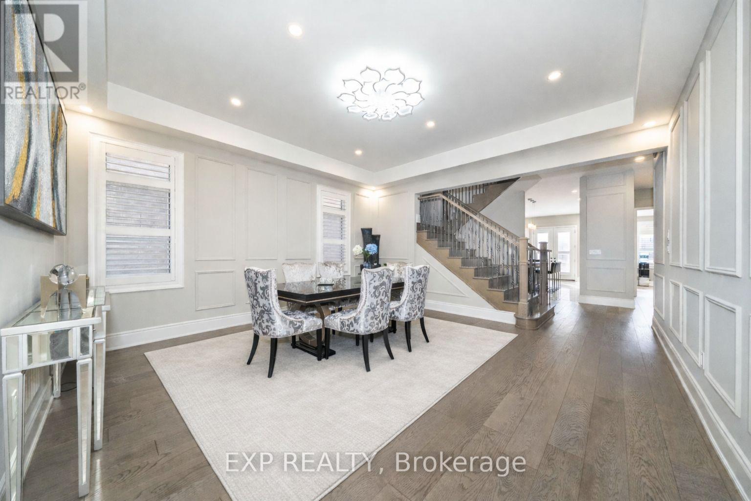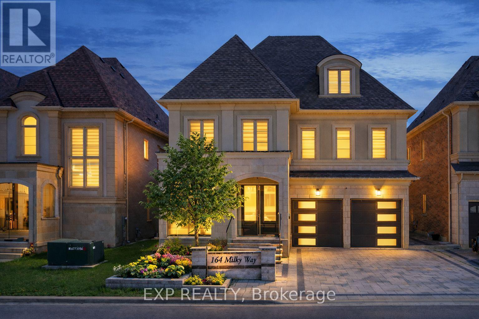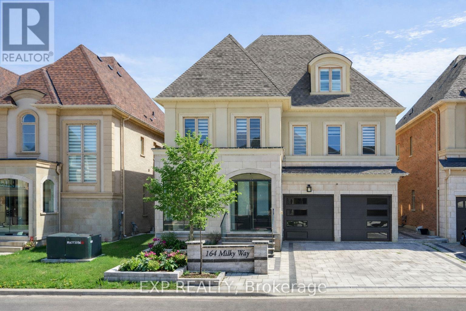 Welcome to 164 Milky Way Drive, an exceptional three-storey detached home offering 4,545 square feet of luxurious above-grade living space (as per MPAC), ideally situated in one of Richmond Hill's most sought-after communities.complete with a 3-car tandem garage. Set on a premium south facing lot with no sidewalk, this remarkable home blends architectural presence with impeccable craftsmanship and tons of custom upgrades. A grand double door entry introduces soaring 10 foot ceilings on the main level and 9 foot ceilings on the upper and lower levels. Rich hardwood flooring flows throughout, complemented by coffered and waffle ceilings, pot lights with dimmers. Designed for both grand entertaining and everyday living, the open concept layout features a formal dining area, a private main floor office, and an inviting family room with a statement waffle ceiling and gas fireplace. The chef inspired kitchen is a showcase of luxury with custom cabinetry, soft closing drawers, and an expansive center island, while a bright breakfast area walks out to the beautifully interlocked backyard. All four bedrooms are generously proportioned, each with its own private ensuite, every room comfortably accommodating a king size bed. The primary retreat offers a spa inspired five piece ensuite and walk in closet. The expansive third floor loft with balcony access provides exceptional flexibility ideal as a guest suite, nanny quarters, executive office, or additional entertainment space. The open basement offers further customization potential. Perfectly positioned minutes to GO Transit, Highways 404 and 407, David Dunlap Observatory Park, fine shopping, dining, and everyday conveniences. (42239552)