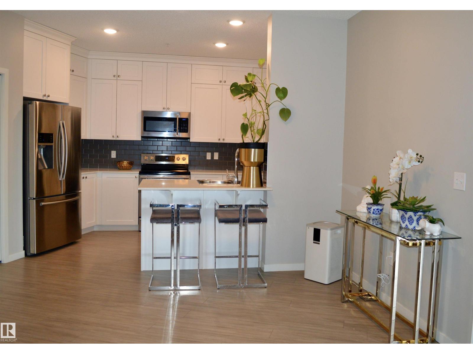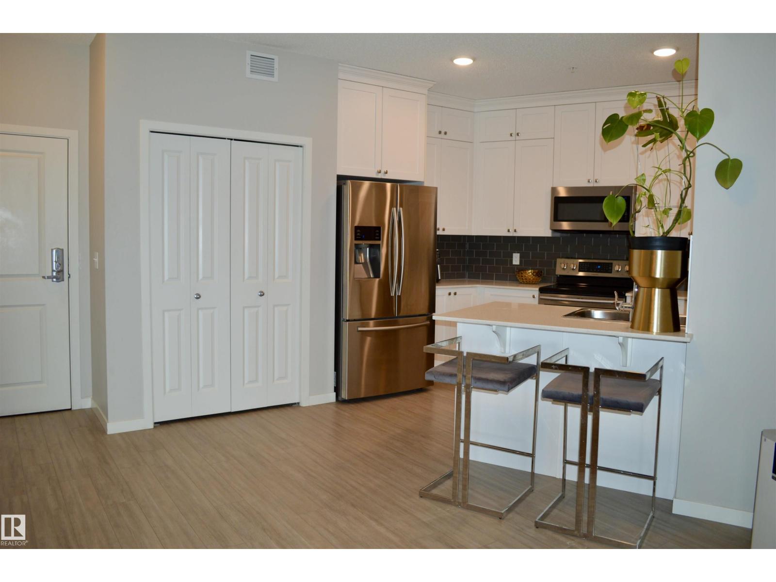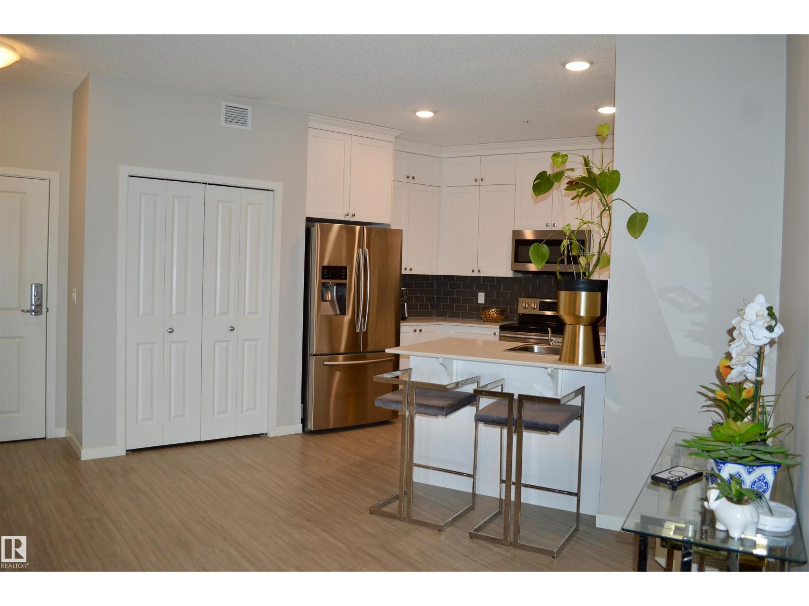 On the top floor this fully upgraded unit is an entertainers dream with 9' ceilings, huge open concept design with space for big dining table and living room, spacious primary bedroom with massive walk in closet and 3 piece bath with 5' glass shower, den off the living room is used as a bedroom, kitchen is stunning with white cabinetry to the ceiling, quartz counter tops and high end stainless steel appliances, full size laundry room off the kitchen, with extra space for shelving and pantry storage. SW exposure off of the balcony with a wonderful view of the sunsets. Garbage shutes on each floor so you don't have to haul it to a dumpster, 2 elevators so you never have to wait long for one, underground parking steps from the elevator. Add to that a car wash.This is an exceptional unit and must be seen. Close to all shopping, amenities, schools and major connecting routes. (33886650)